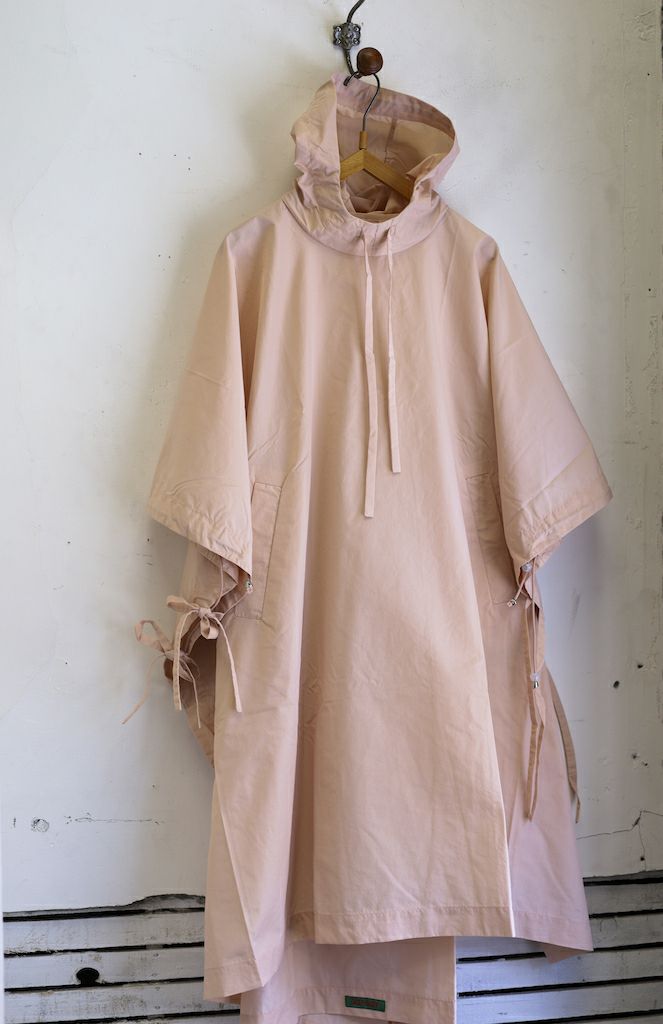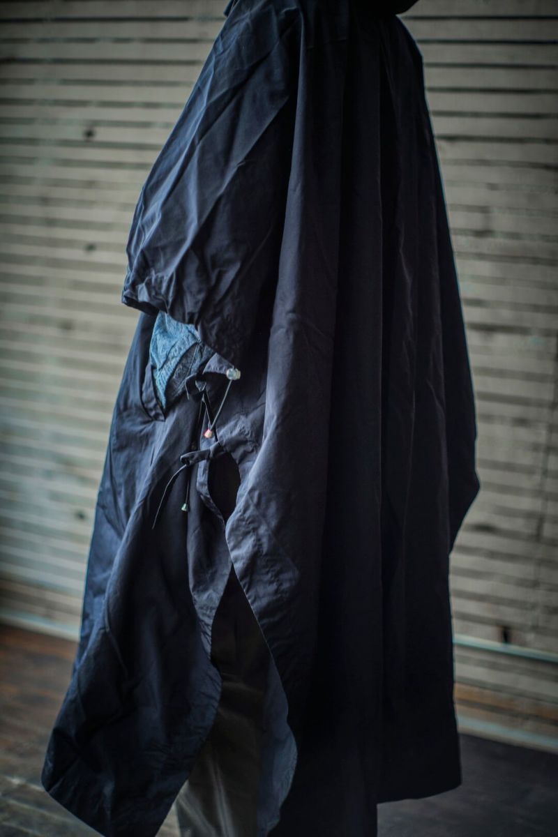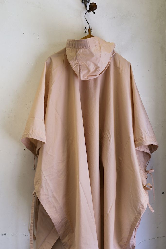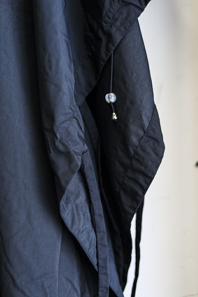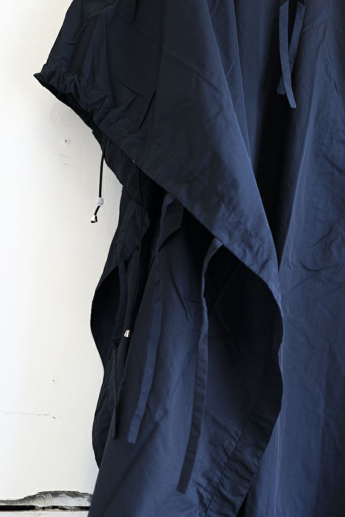 CASEY CASEYらしいドレープ感が特徴的なロングポンチョ。長方形にカットされたパターンですが、着用する事で抜群のシルエットを描きます。素材は撥水性に富んだ生地なので、悪天候やレジャーシーンでも活躍する一枚です。CASEY CASEYは勿論、KENNETH FIELD等のジャケットの上から着ても相性抜群。普段のコーディネートにプラスワンするだけで、また違うスタイルが生まれるはずです。