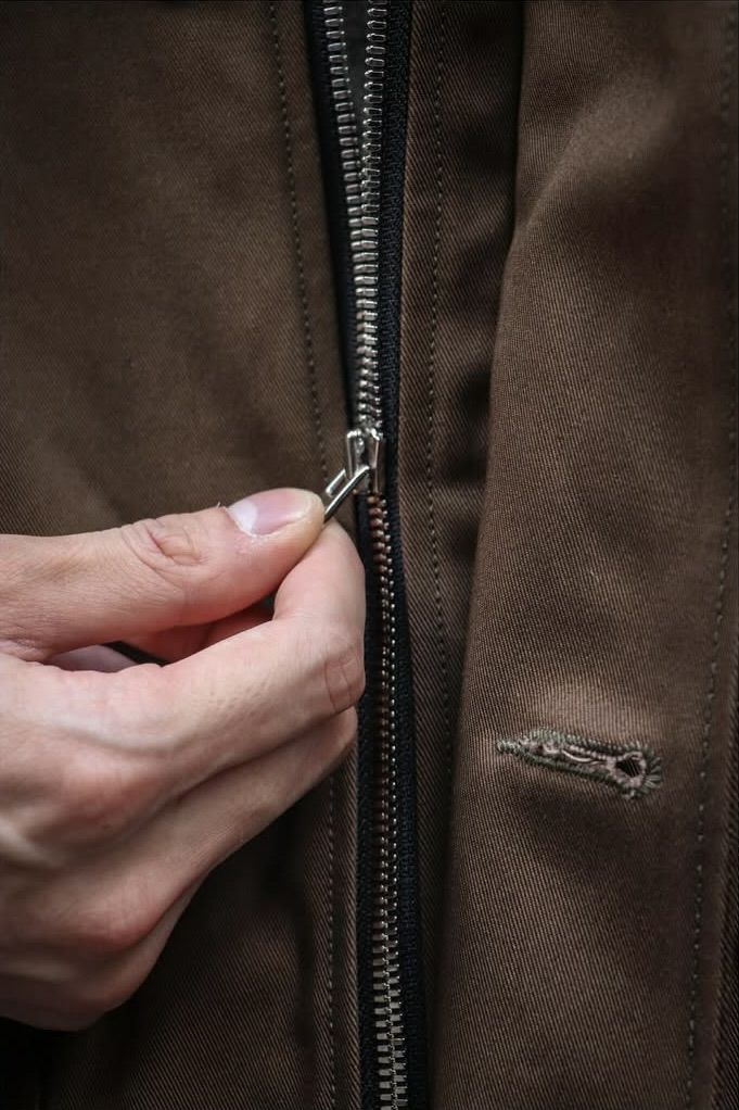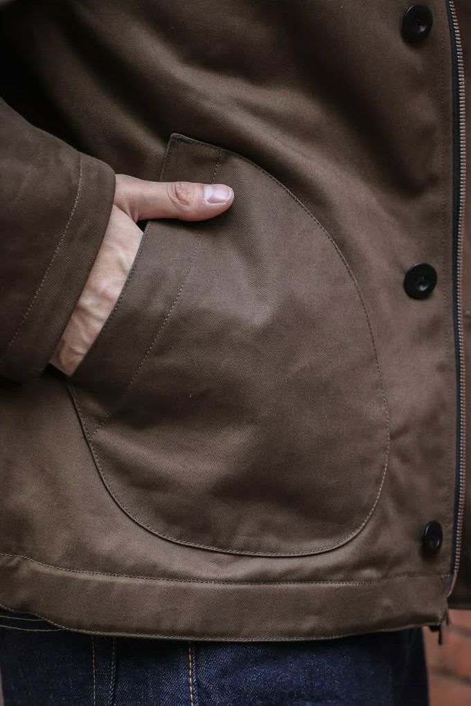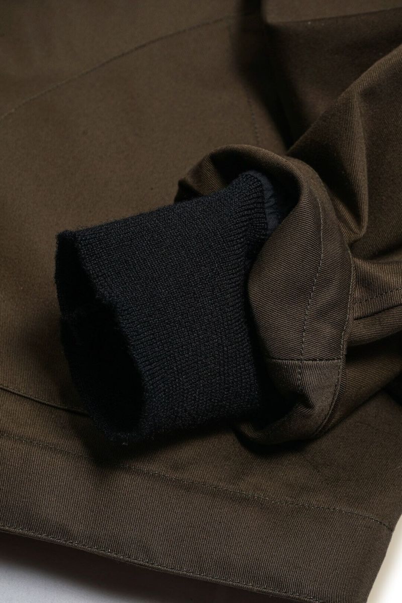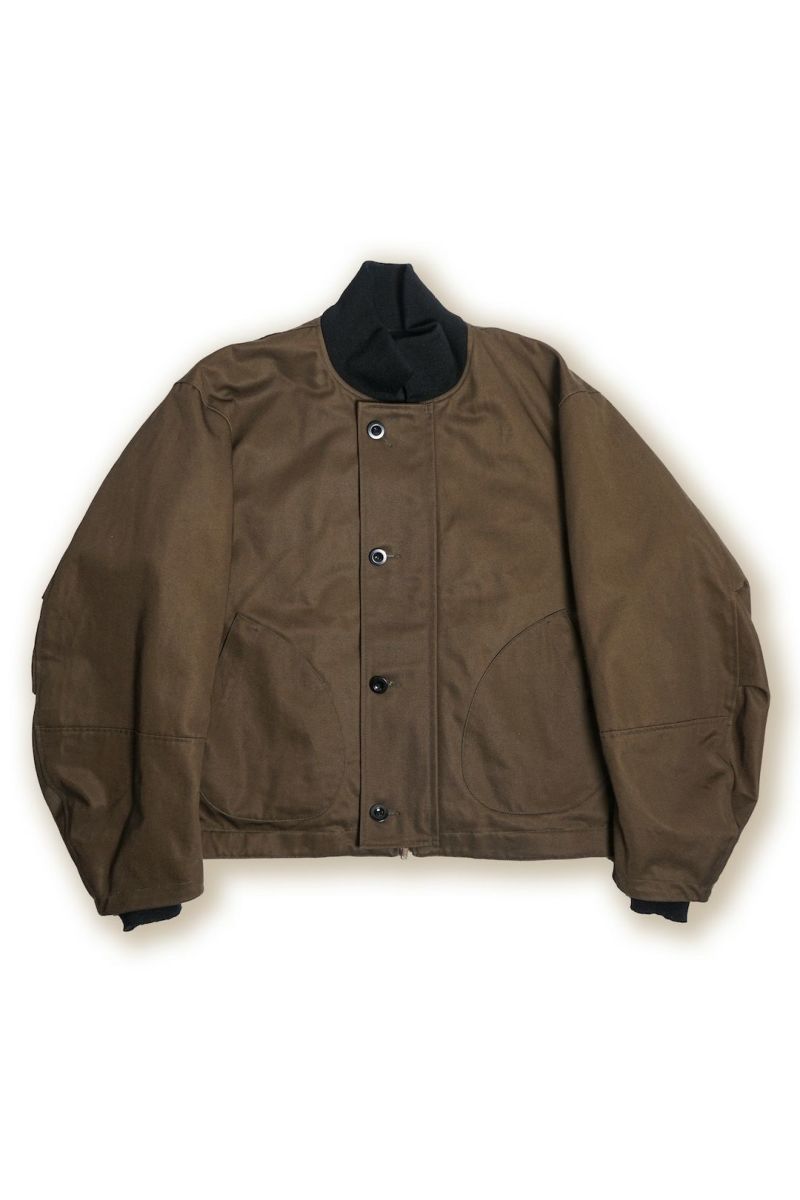 沢山のギャザーが入った背面と立体的に裁断されたアームが目を惹くボリュームのあるブルゾン。アメリカ軍のヴィンテージデッキジャケットから着想を得ています。素材は、コンパクト紡績のコームドコットンを織り上げたチノクロス。高密度で肌理の美しいチノは洗っても引き締まった表情を保ちます。