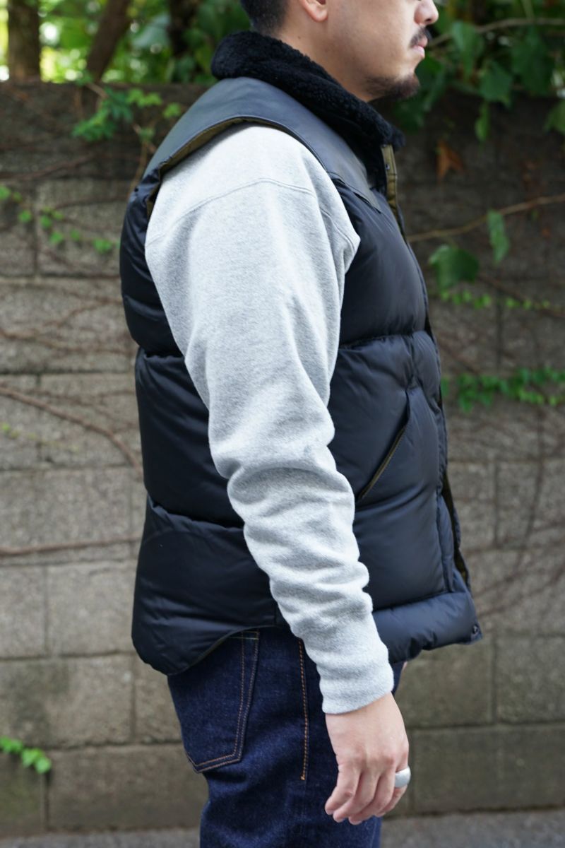 Rocky Mountain Featherbedのオリジナルアイテム、クリスティーベスト。一枚裁ちのヨークレザーと襟の天然ムートンが特徴的なモデルです。