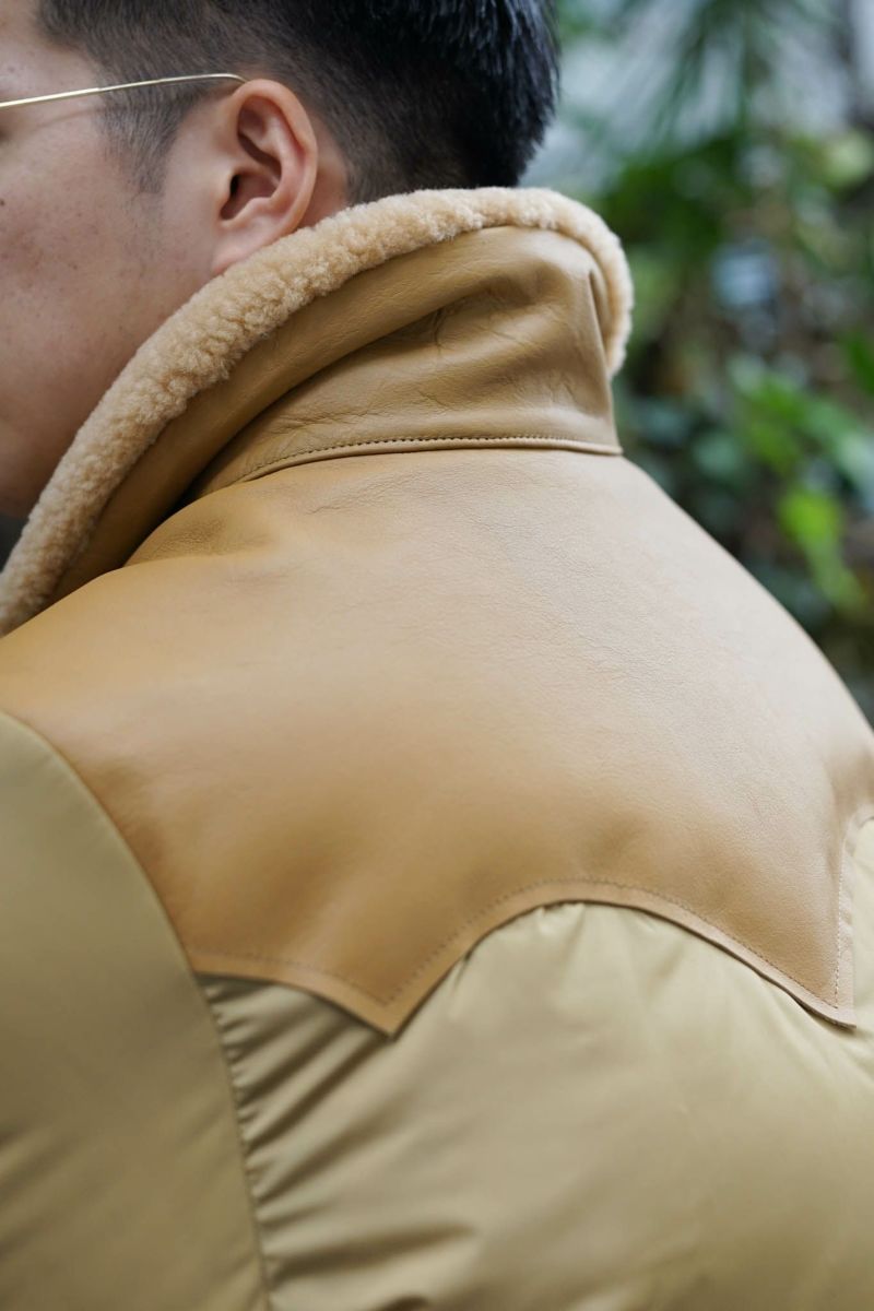 Rocky Mountain Featherbedを象徴する永遠の定番「Christy Jacket」。1970年代のアメリカンアウトドアをルーツに、一枚裁ちのレザー ヨークと贅沢な天然ムートン襟が特徴の代表モデルです。