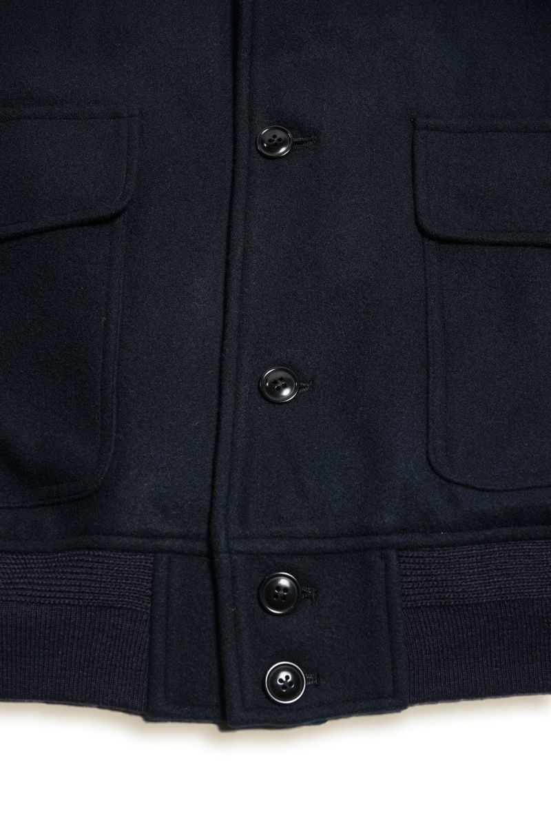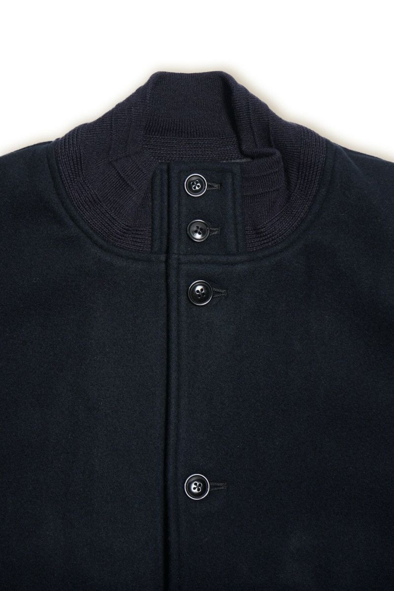 プラップ付のポケットはサイドからも手が入る2層構造にアレンジを加えています。それぞれパターンの異なる編地で編み立てたウール混のリブが衿、袖口、裾につきます。