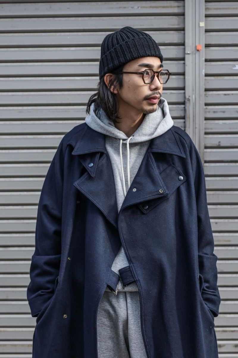 こちらは、しなやかなウールメルトン生地を採用したARCHエクスクルーシブの一着です。無骨なコートにドレープ感のある生地の組み合わせが、ラギットさとエレガントさを兼ね備えた仕上がりです。