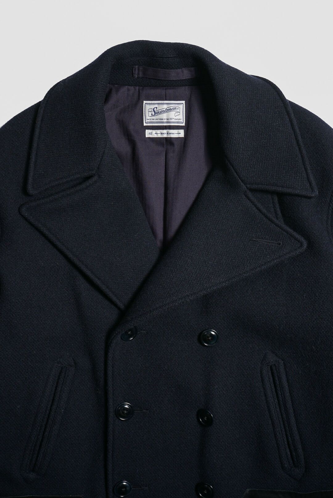 Soundman(サウンドマン) 1940年代のロイヤルネイビーダブルブレスト両前仕立てのリーファーコートがイメージソース。 腕の上げ下げが楽になるピボットスリーブに湾曲したアームがつくフォルムはモーターサイクルコートから。 その他ボタンにて調整するバックベルト、それぞれ同時代の別のコートのディティールから取り入れ、いわゆるレプリカのそれとは一線を画すオリジナルデザインとなる。表地はオイルカット加工を施しデッドストックのような風合いを持つ二重織りのウールメルトン。腰ポケットの補強にはレザー(牛皮)を使用。ボタンはナットボタン。 <素材> 表地 : Wool 90% Nylon10% 裏地 : Cotton 100% 袖裏地 : Polyester 100% <生産国> MADE IN JAPAN Soundman / Reefer PRICE ¥99,000(税込み)
