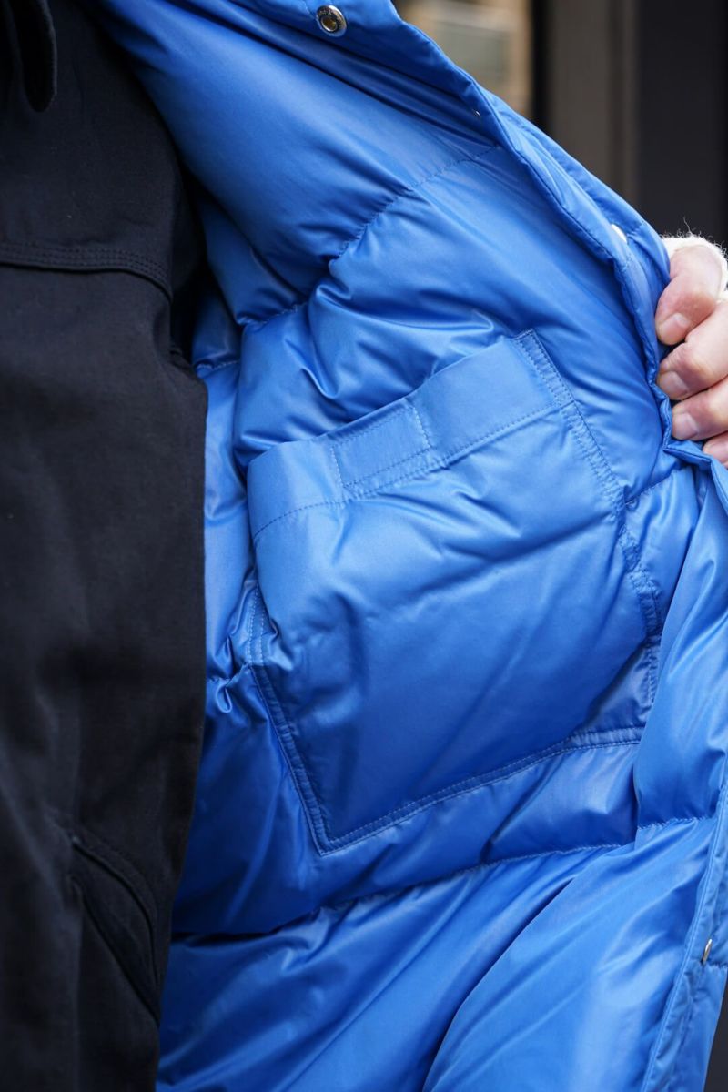 今回のダウンジャケットの特徴が「ダブルチューブ製法」と呼ばれる構造。表と裏、2つのダウンパックを組み合わせ、ステッチを段違いにする事で、表地と裏地の間に空間を生み、保温力を発揮するという非常に理にかなった製法です。