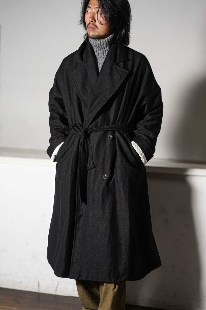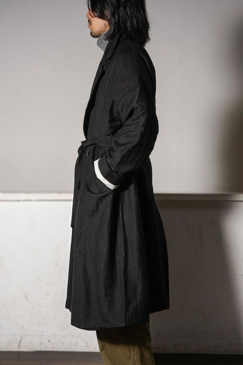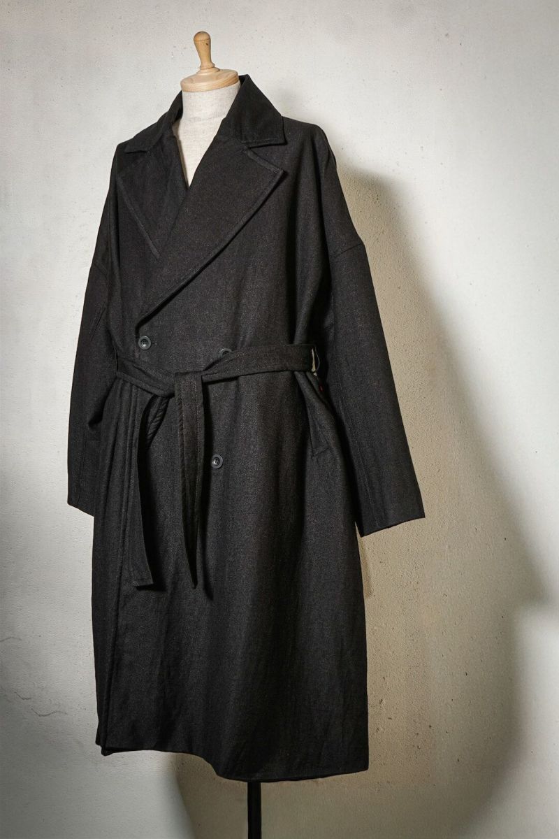 テーラードカラー、シルエットを調整するための取り外し可能なウエストベルトを備えた、迫力のあるダブルブレストコート。素材はリネンの通気性とウールの暖かさを両立した混紡生地を使用しています。自然なドレープ感と深みのある風合い豊かな生地感が魅力的です。