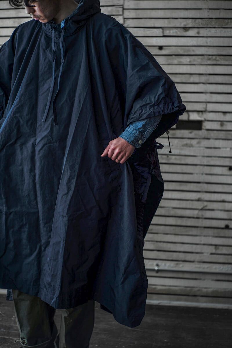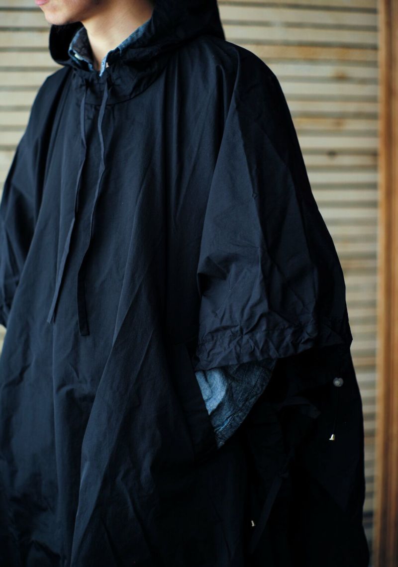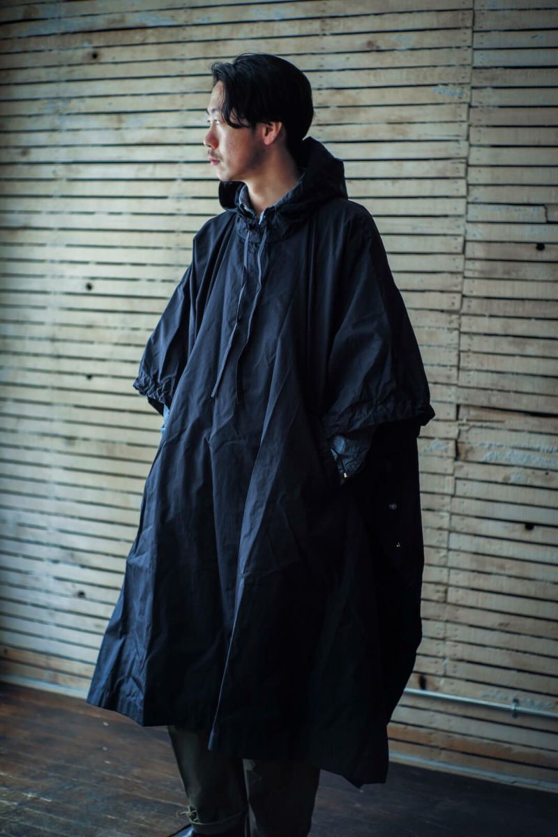 CASEY CASEYらしいドレープ感が特徴的なロングポンチョ。長方形にカットされたパターンですが、着用する事で抜群のシルエットを描きます。素材は撥水性に富んだ生地なので、悪天候やレジャーシーンでも活躍する一枚です。CASEY CASEYは勿論、KENNETH FIELD等のジャケットの上から着ても相性抜群。普段のコーディネートにプラスワンするだけで、また違うスタイルが生まれるはずです。