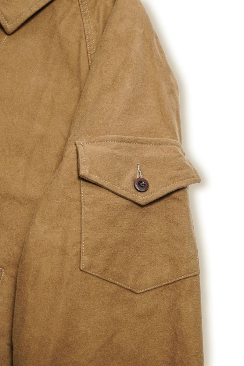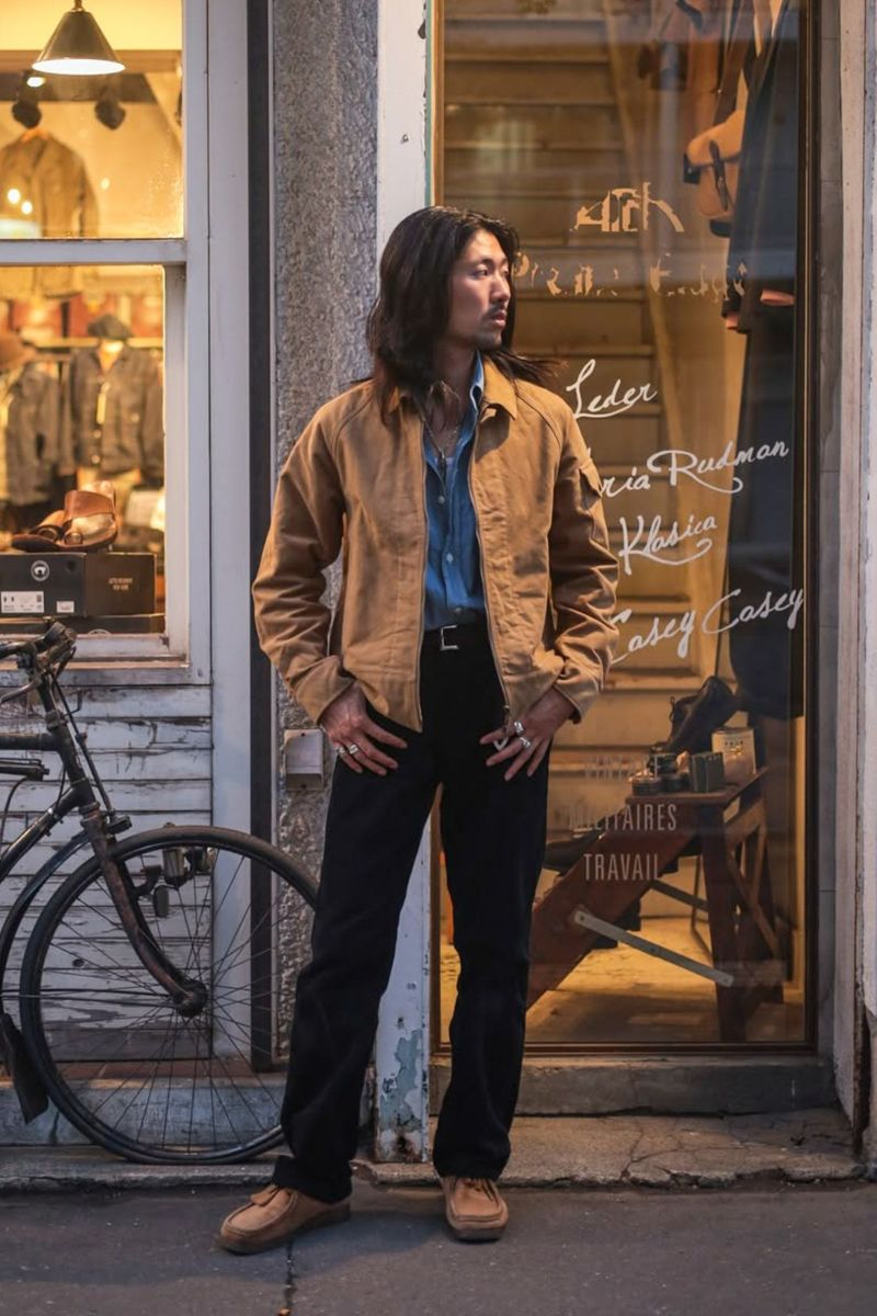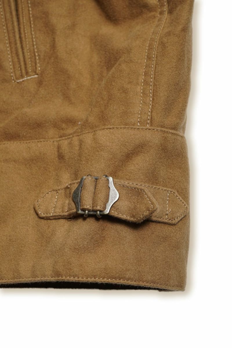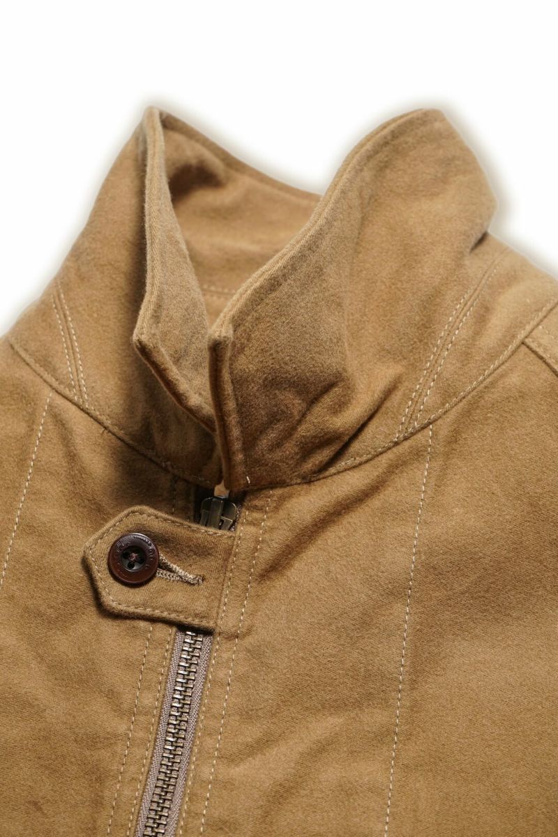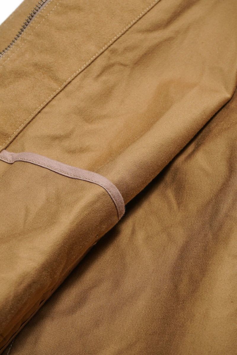 シガレットポケットを叩きつけた。シンプル極まりないフォルムだが、襟下のファスナー口に叩いたタブや腰ポケットの玉淵にたこ糸を入れるなど細かいディティール使いは当ブランドならでは。素材はオーガニックコットンを高密度で織り上げ、起毛加工を施したモールスキン。シルエットはストレートだが腰ベルト尾錠にて裾のアジャスト、フロントのダブルファスナーで調整できる仕様。