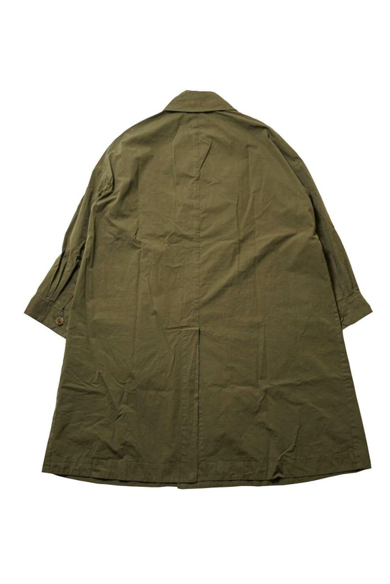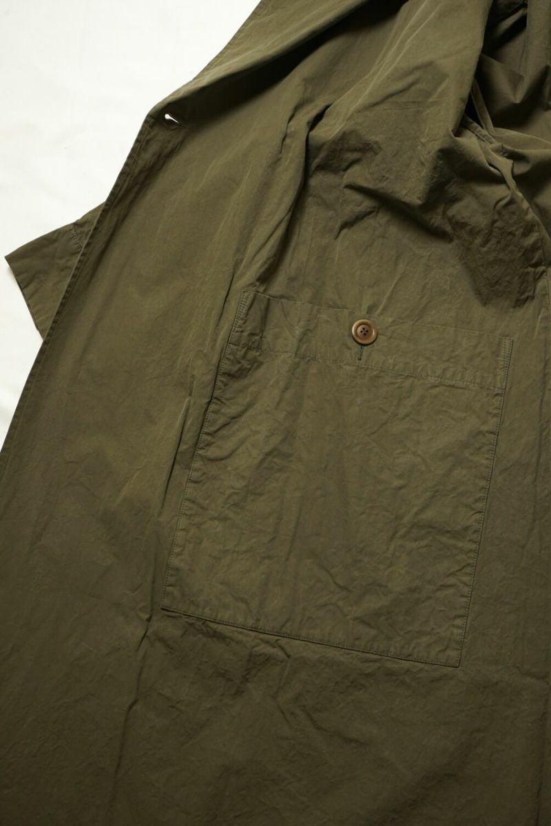 ミリタリー由来のデザインをCASEY CASEY流にアレンジして仕上げられたラグランスリーブのオーバーコート。エジプシャンコットンを使用し、先染めで深みのある色に仕上げられたエクスクルーシブの高密度生地は、洗うたびに美しさが増していきます。