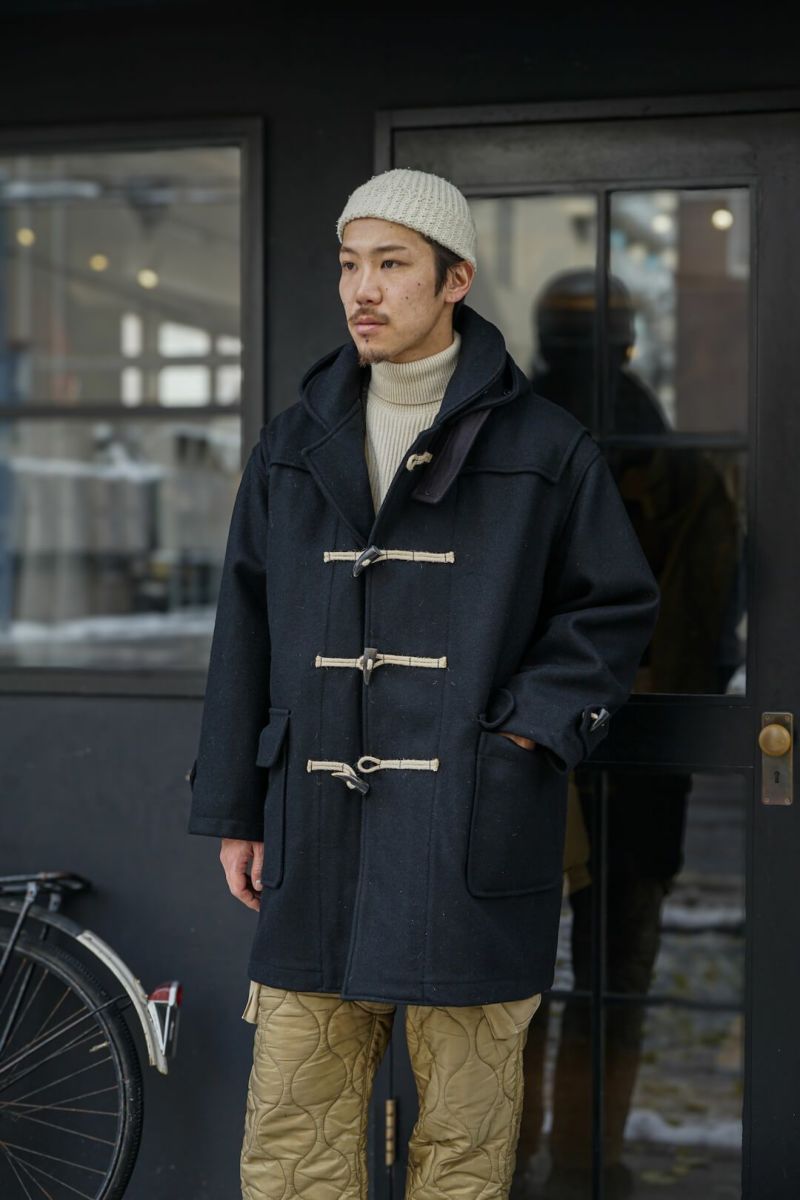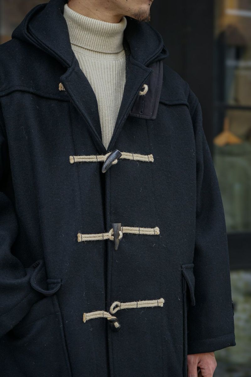 限りなくブラックに近いネイビーの色合いは、このコートのデザイン、仕様に最もマッチしており、私たちが理想とするダッフルコートの姿に限りなく近づいていると考えます。