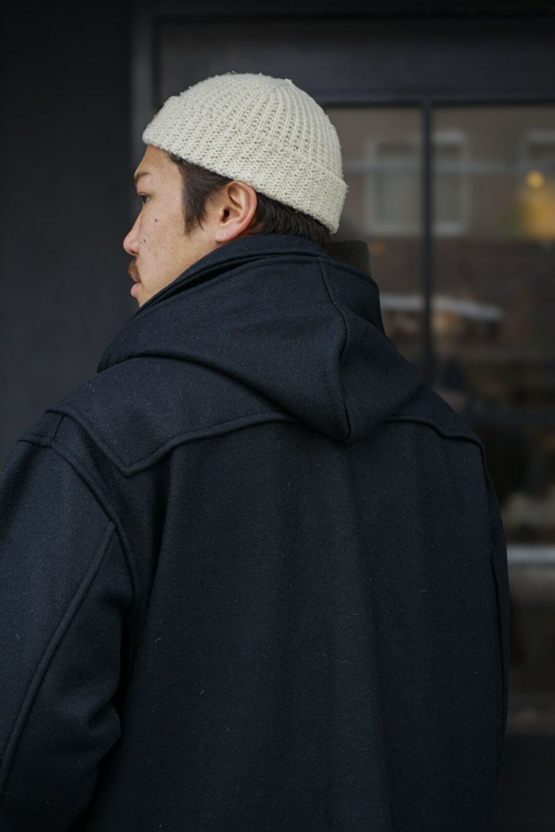 当時のオリジナルと、1940年代ROYAL NAVY物のデザインを踏襲し、あえて現代的なアレンジは施さずにオリジナルをリスペクトしたパターンメイキングにて製作いたしました。ダッフルコート=優等生、というイメージが日本では浸透していますが、本来は漁師や英海軍の作業着(ワークウェア)というルーツを持つ、質実剛健な男らしいコートである、という立ち位置を大事にしています。