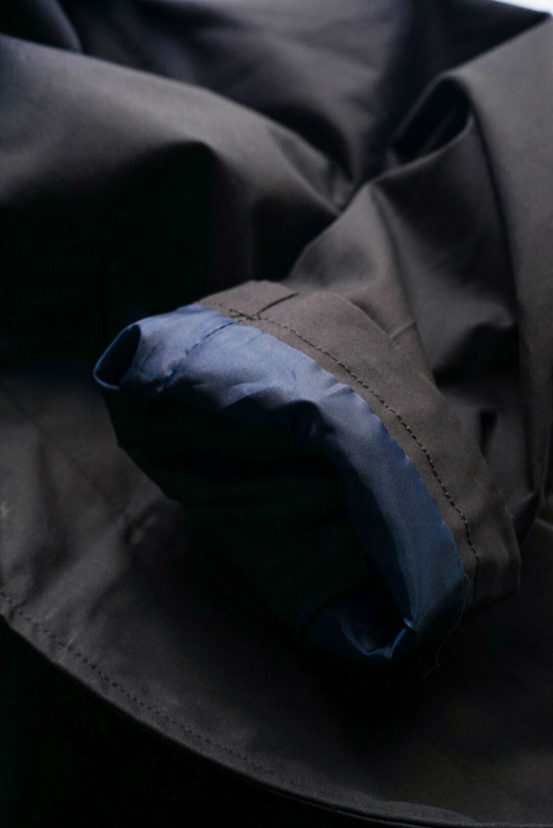 当時のスプリットラグラン仕様は「いかり肩」になっており、現代的には着づらい要因となっていますが、袖幅やアームホール、肩位置のバランスに調整を加えることで、着心地の良さと見た目の良さを両立できるようにアップデートしています。また、襟のシルエットに改良を加えることで、立ち襟で着用した際にスタイリッシュな雰囲気が出るようにしているのもポイント。