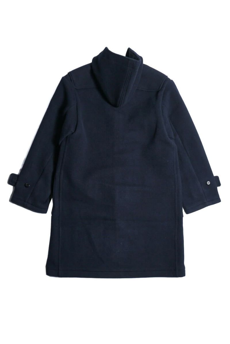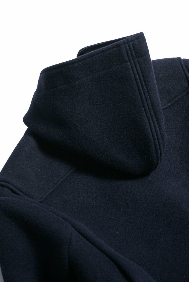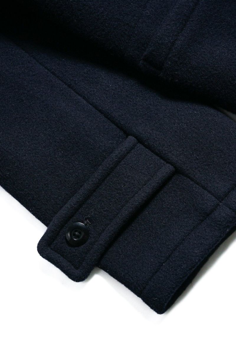 生地のカシミア混ネイビーメルトンは旧式の織機で空地を含みつつ丹念に織られています。そこに通常のメルトン生地にを遥かに上回る回数の起毛工程を加えることで上品な生地に仕上がっています。トグルはあえて経年変化を楽しめるように素仕上げにしており、トグルの紐もこのダッフルコートの為だけに独自の染色を施した濃紺の麻紐を使用。