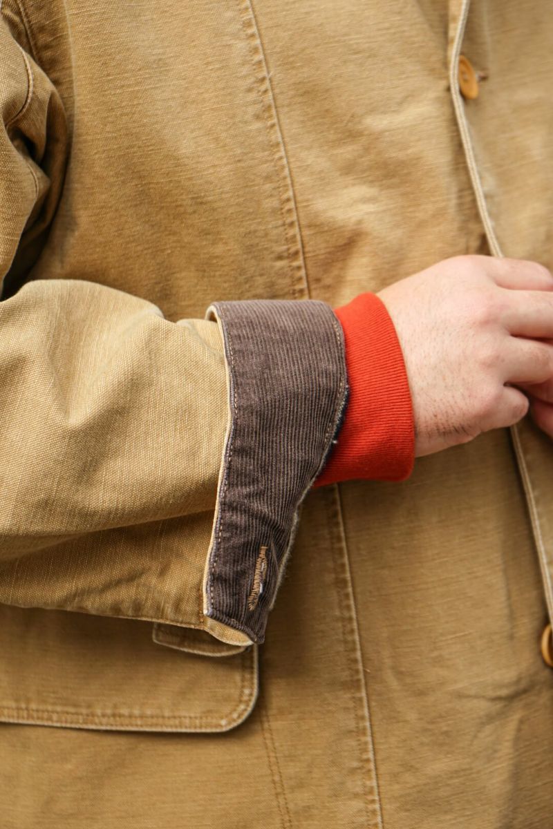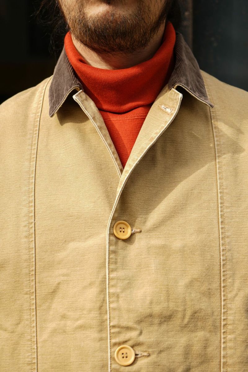 ビンテージのハンティング・フィールドコートをリプロダクションしたジャケットです。シンプルながら特徴的なデザインで、前身頃の独特な切り替えや、手が入れ易い真横に配置されたフラップ付きポケットがポイントです。初登場となる25FWコレクションでは、丈夫なワークウエア素材のコットンダックを使用し、裏地には暖かみのあるボーダーブランケットを採用。ビンテージコットンダックのリプロダクション生地は、ビンテージ特有のヨコムラの出方にこだわりっています。芯まで染まりきらない特殊染色により、味わい深い表情となります。