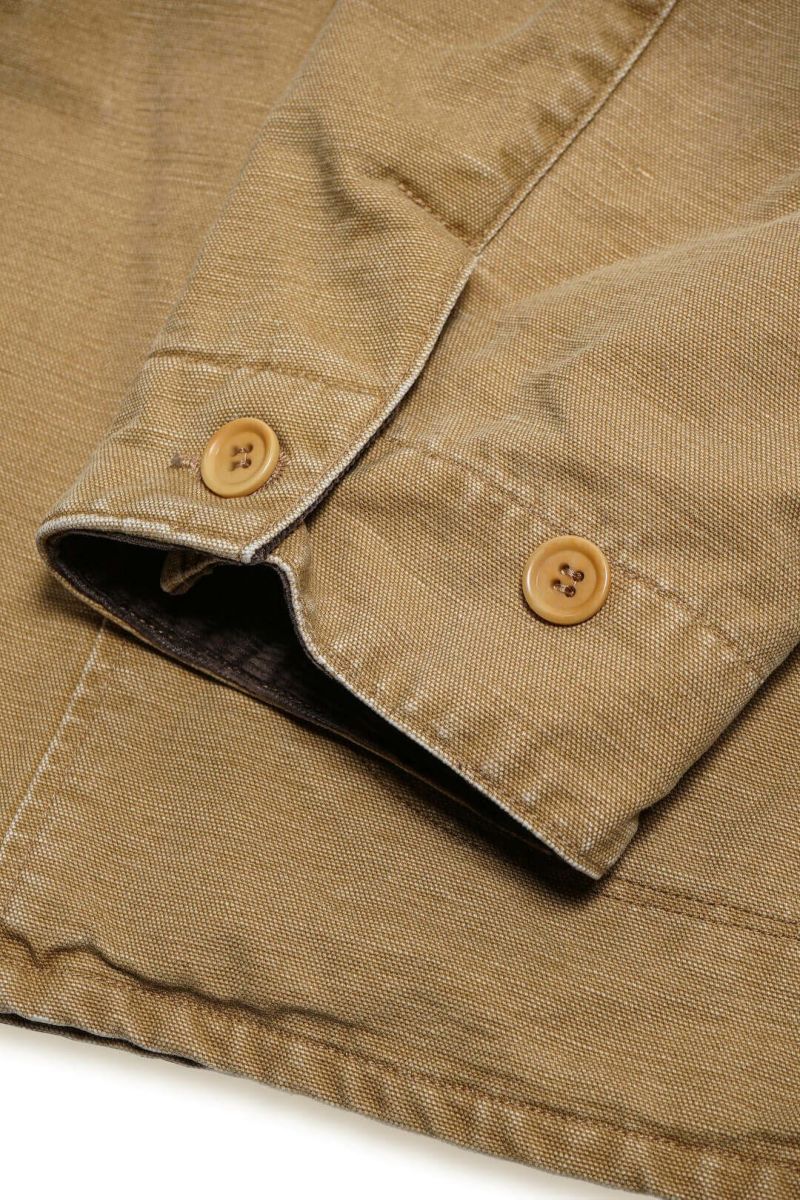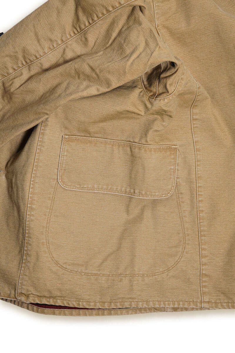 ビンテージのハンティング・フィールドコートをリプロダクションしたジャケットです。シンプルながら特徴的なデザインで、前身頃の独特な切り替えや、手が入れ易い真横に配置されたフラップ付きポケットがポイントです。初登場となる25FWコレクションでは、丈夫なワークウエア素材のコットンダックを使用し、裏地には暖かみのあるボーダーブランケットを採用。ビンテージコットンダックのリプロダクション生地は、ビンテージ特有のヨコムラの出方にこだわりっています。芯まで染まりきらない特殊染色により、味わい深い表情となります。