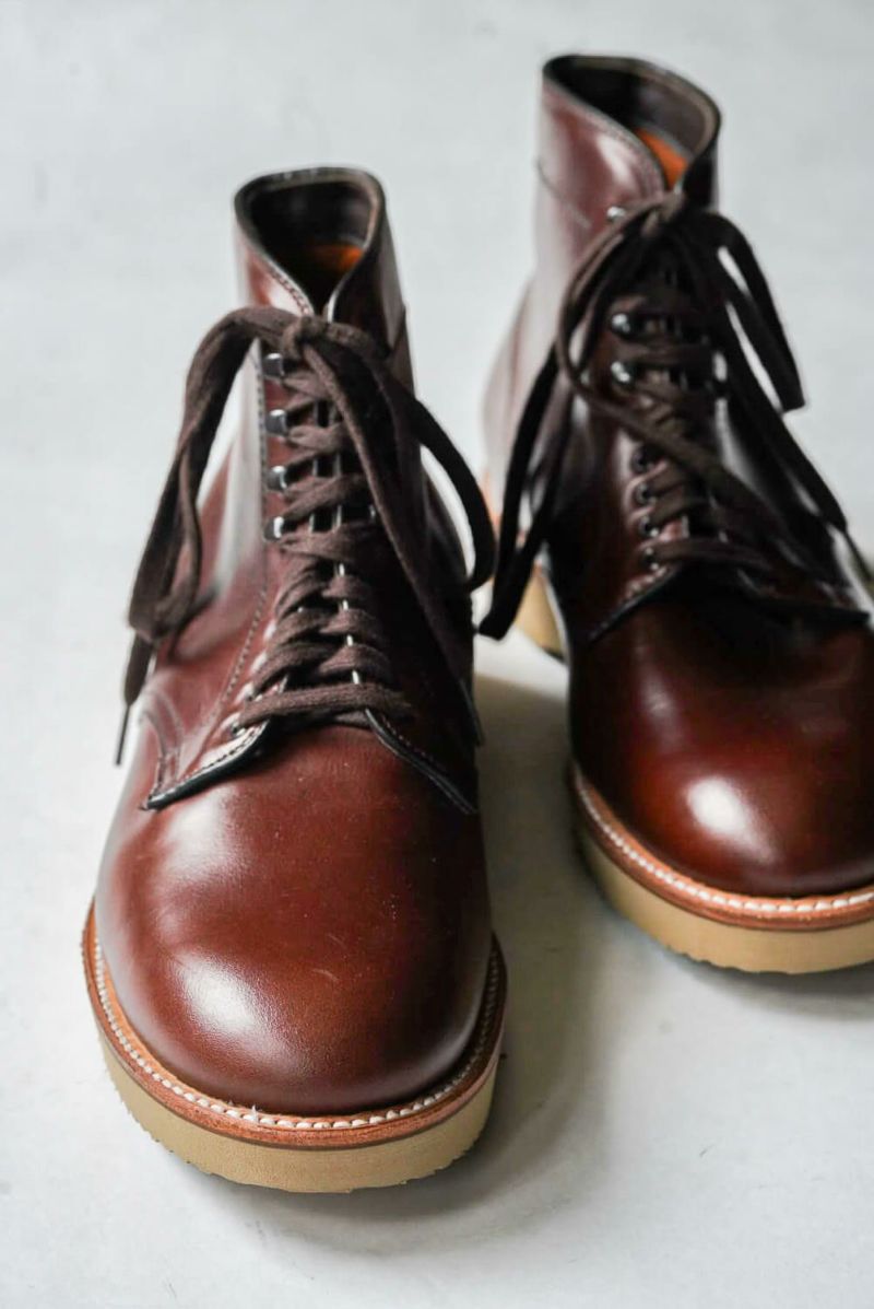 379X(ミリタリー)ラストを使用した定番モデルのプレーントゥブーツです。レザーはホーウィン社のクロームエクセルレザーを採用。油分が多く含まれており、味のあるエイジングを魅せてくれます。水濡れにも強く扱いやすいのも特徴。ソールには軽量のスーパーライトクッションソールを採用しています。