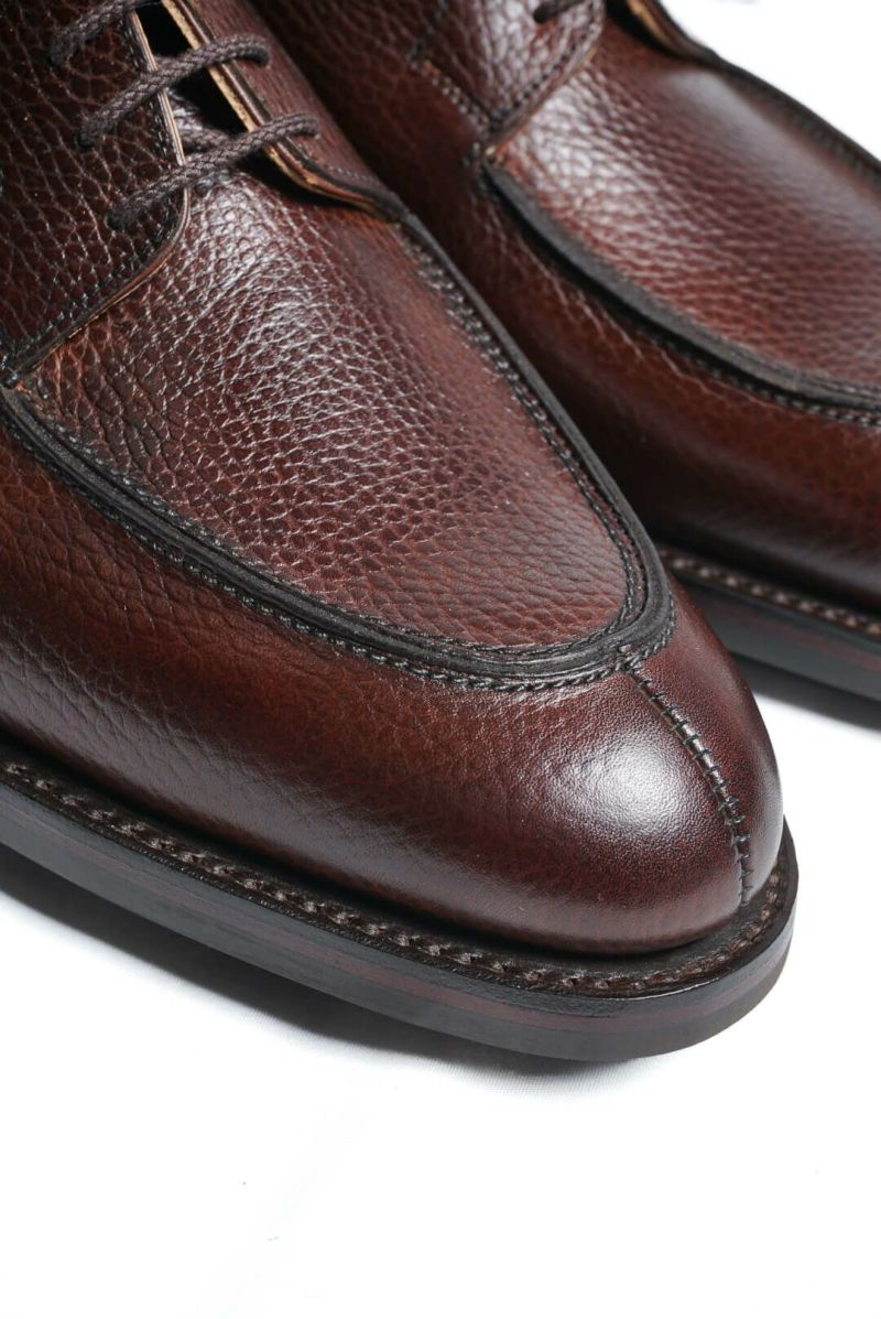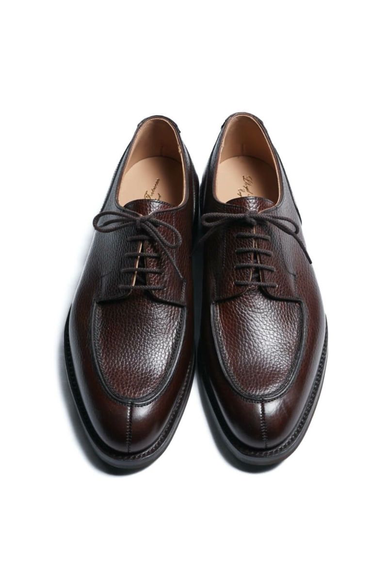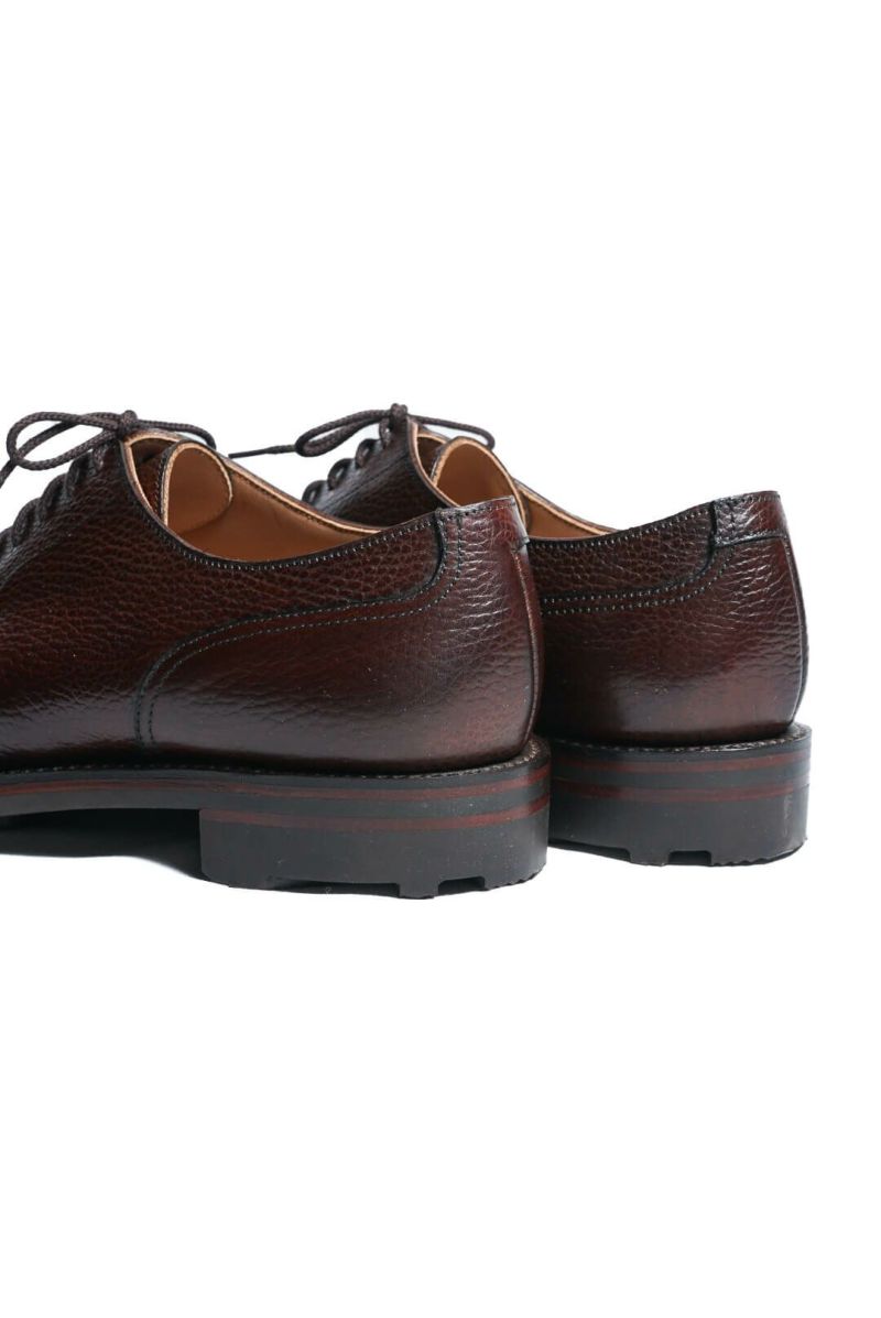 イギリスノーザンプトンのトップランクの工場で製作されているカントリーエプロンダービー。最小限の工程を機械で行ない、仕上げを含めほとんどがハンドメイドです。抜群のコストパフォーマンスを誇ります。厚手のグレインレザーを使用しリッジウエイソール仕立てのがっしりとしたカントリーティストの靴です。