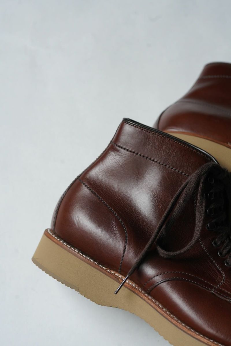 379X(ミリタリー)ラストを使用した定番モデルのプレーントゥブーツです。レザーはホーウィン社のクロームエクセルレザーを採用。油分が多く含まれており、味のあるエイジングを魅せてくれます。水濡れにも強く扱いやすいのも特徴。ソールには軽量のスーパーライトクッションソールを採用しています。