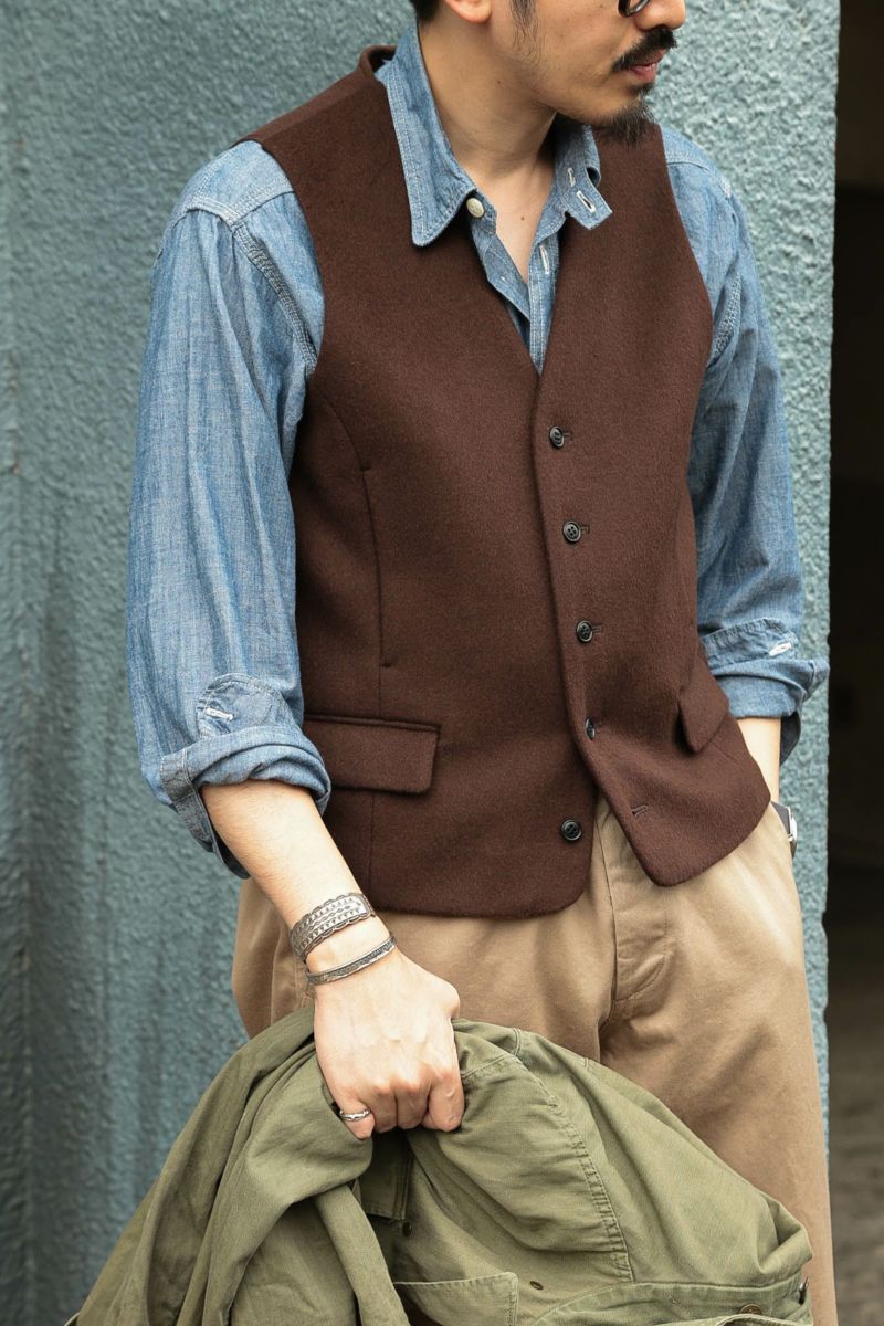 KENNETH FIELD 25AWのテーマ “Lodge(ロッジ)” を象徴するブラウンカラーをセレクト。ドレスとカジュアルの架け橋しとなるベストです。背面のバックルは通常ひとつのところを、ハンティングベストの要素を取り入れた二つのバックル仕様に。ウエスト調整だけでなく、デザインとしての存在感も際立ちます。フラップ付きポケットに加えシームポケットも完備した、KENNETH FIELDらしい特別感のあるディテールです。裏地には鮮やかなオレンジを配し、オリジナルのリーフ柄をあしらったキュプラを使用しています。