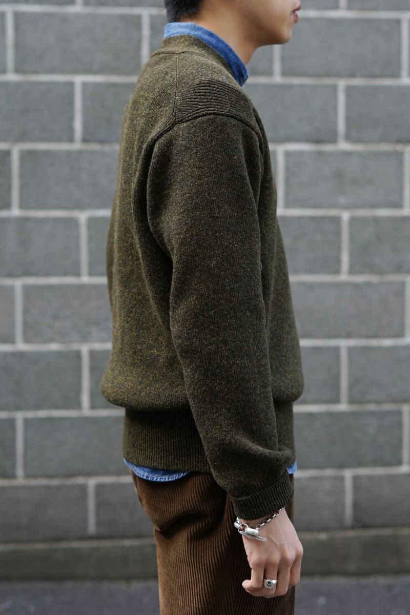 米海軍の水兵のために作られた通称「GOB」セーターをモチーフにしたモデルのVネックバージョン。クロスVのデザインで、ミリタリーイメージに仕上げています。肩やアームホールはセットインスリーブのパターンになっていますが、着用時は余裕のあるサイズ感なのでドロップショルダーになります。