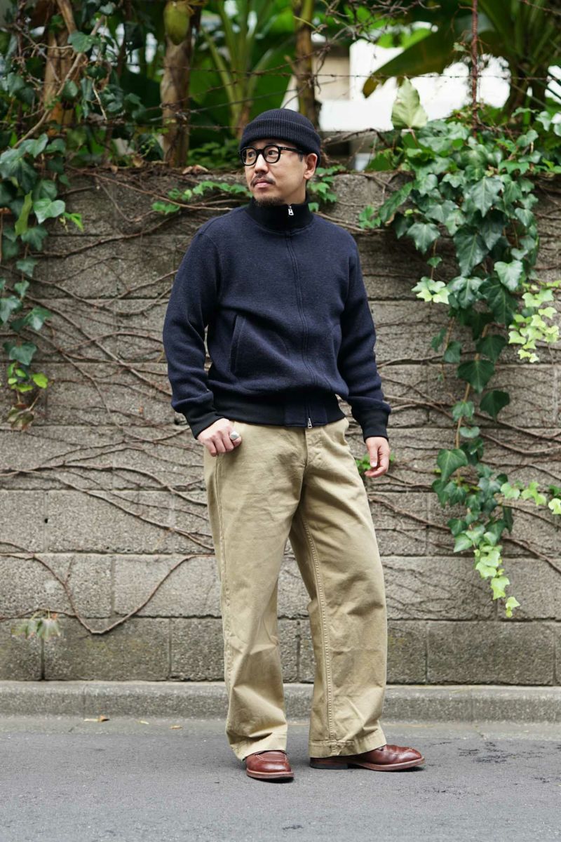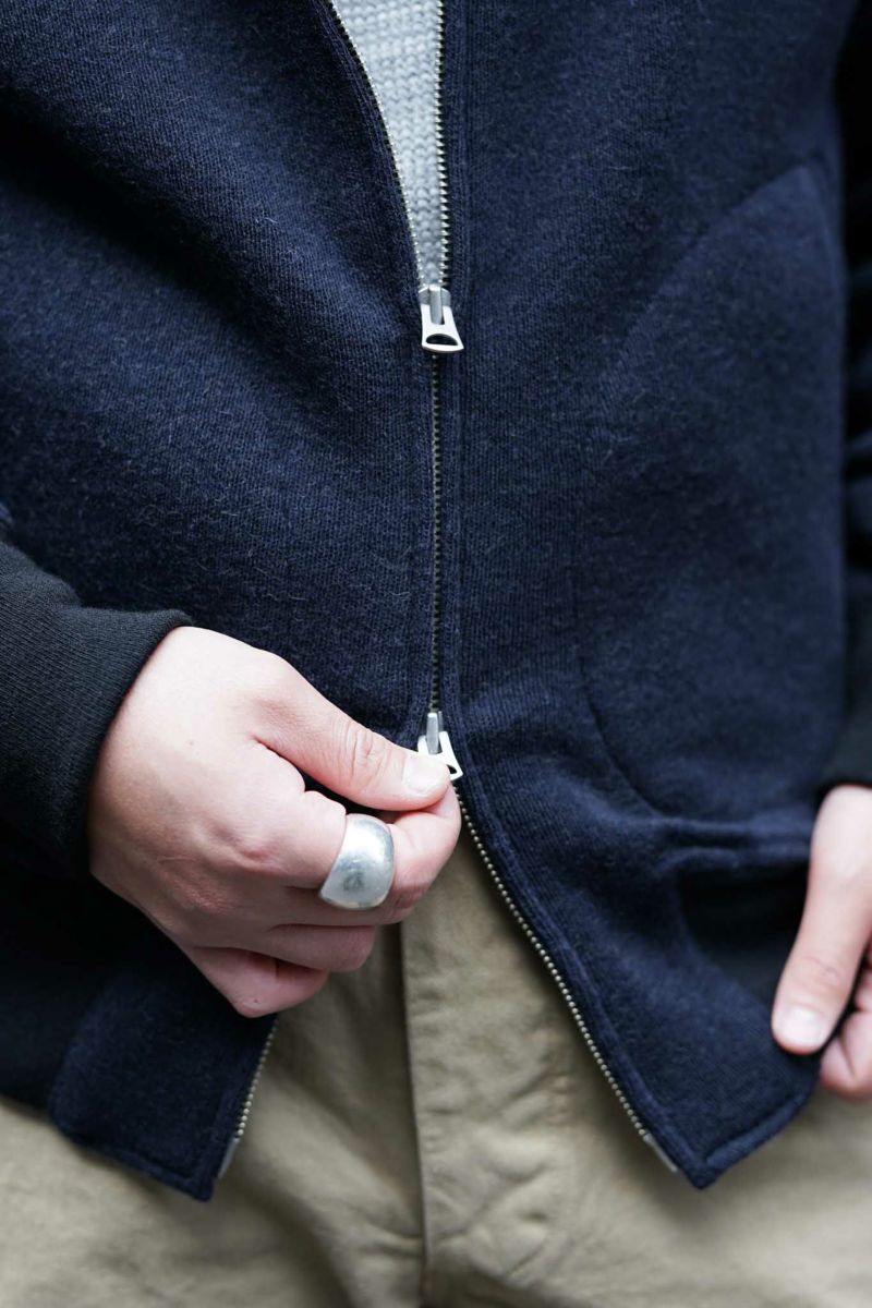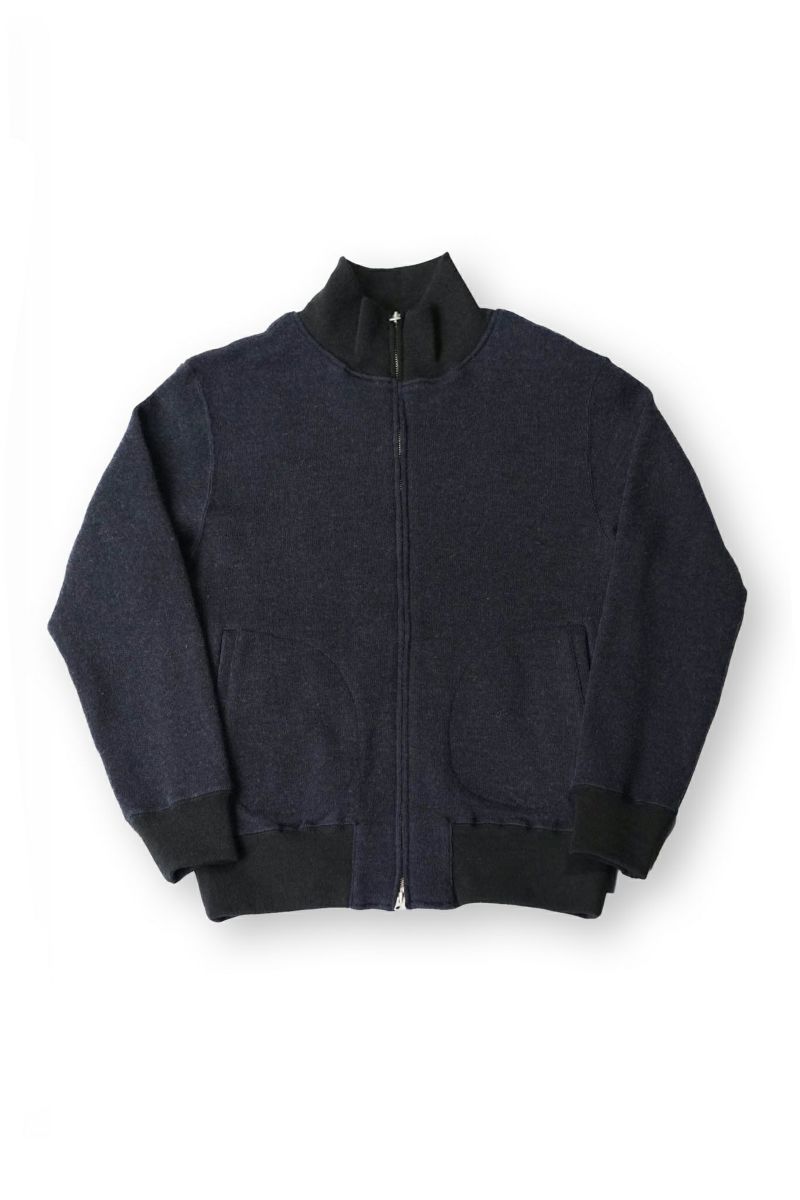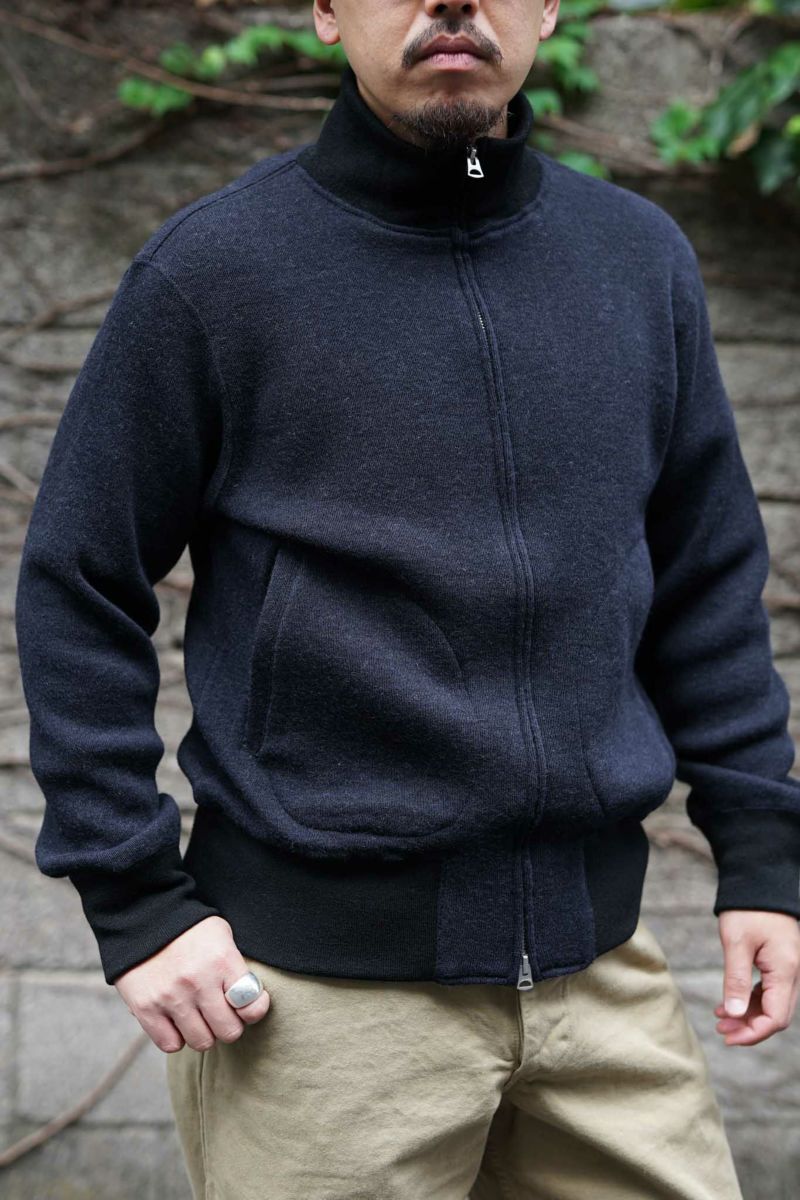 US NAVYのデッキジャケットがイメージソースのニットブルゾン。微妙な配色の差があるリブとのコンビネーションが魅力的です。素材は古着屋で偶然見つけた40〜50年代と思われるMADE IN USAのカーディガンを元に作られたオリジナルのもの。出来上がりの肉感に合わせて質感と共に最適な番手のウールを選定、カリカリに強撚し、糸を作り上げました。当時使われていた機械や作り方などが現在とは全く異なるため、制作において多くの試行錯誤を重ね出来上がった、渾身のプロダクトです。