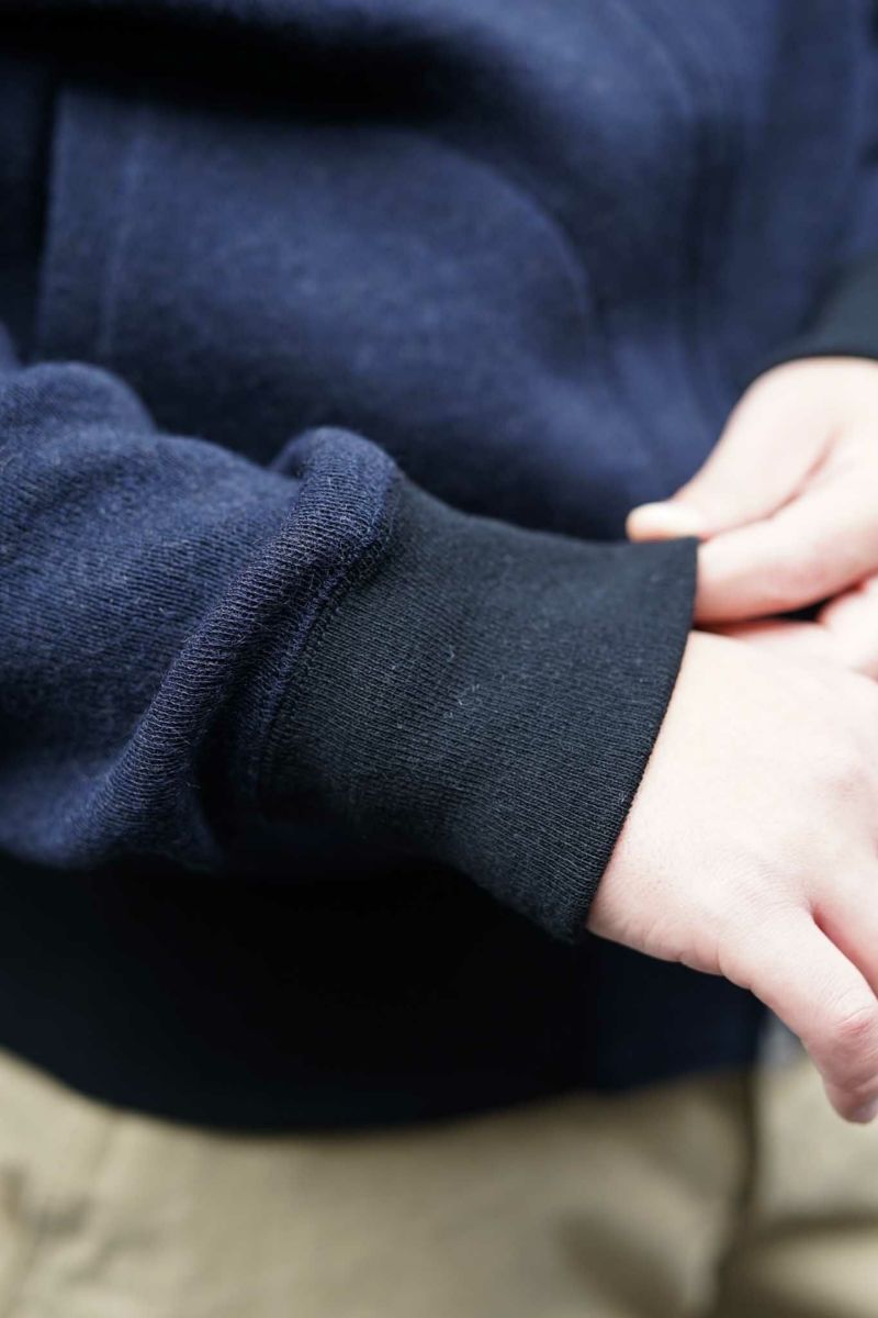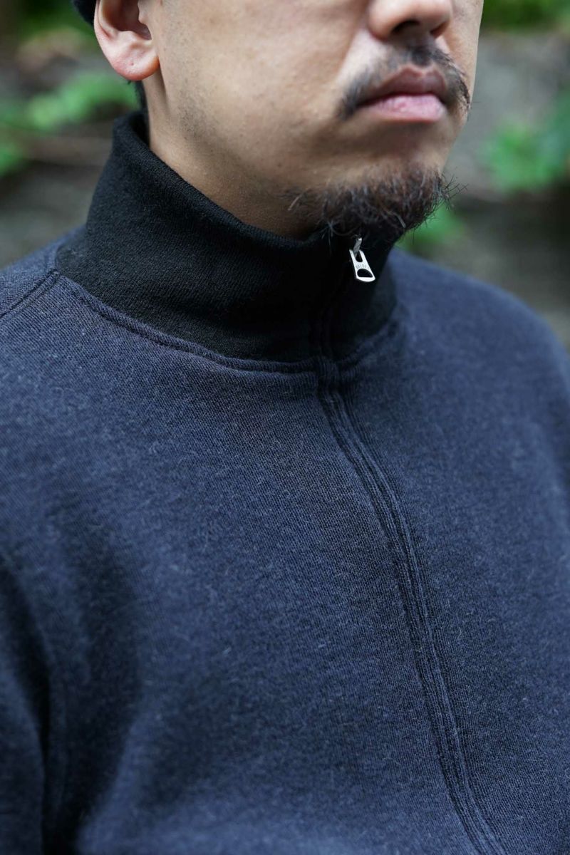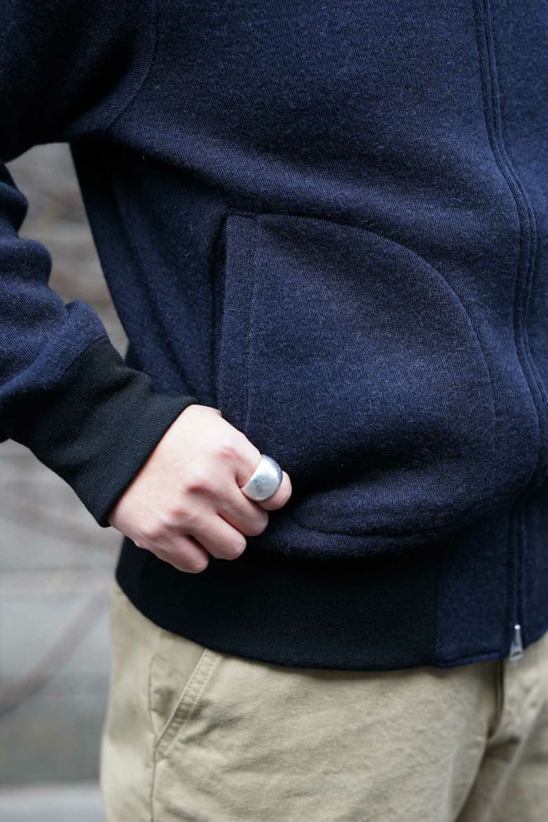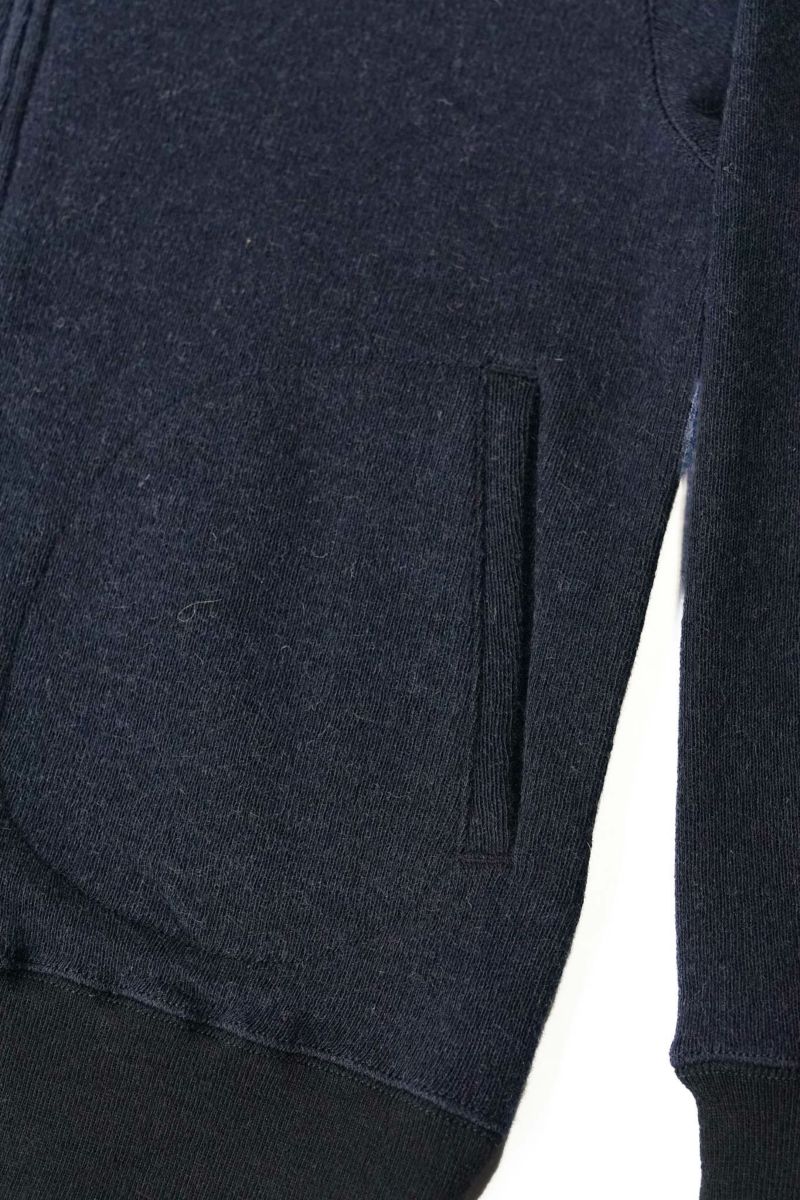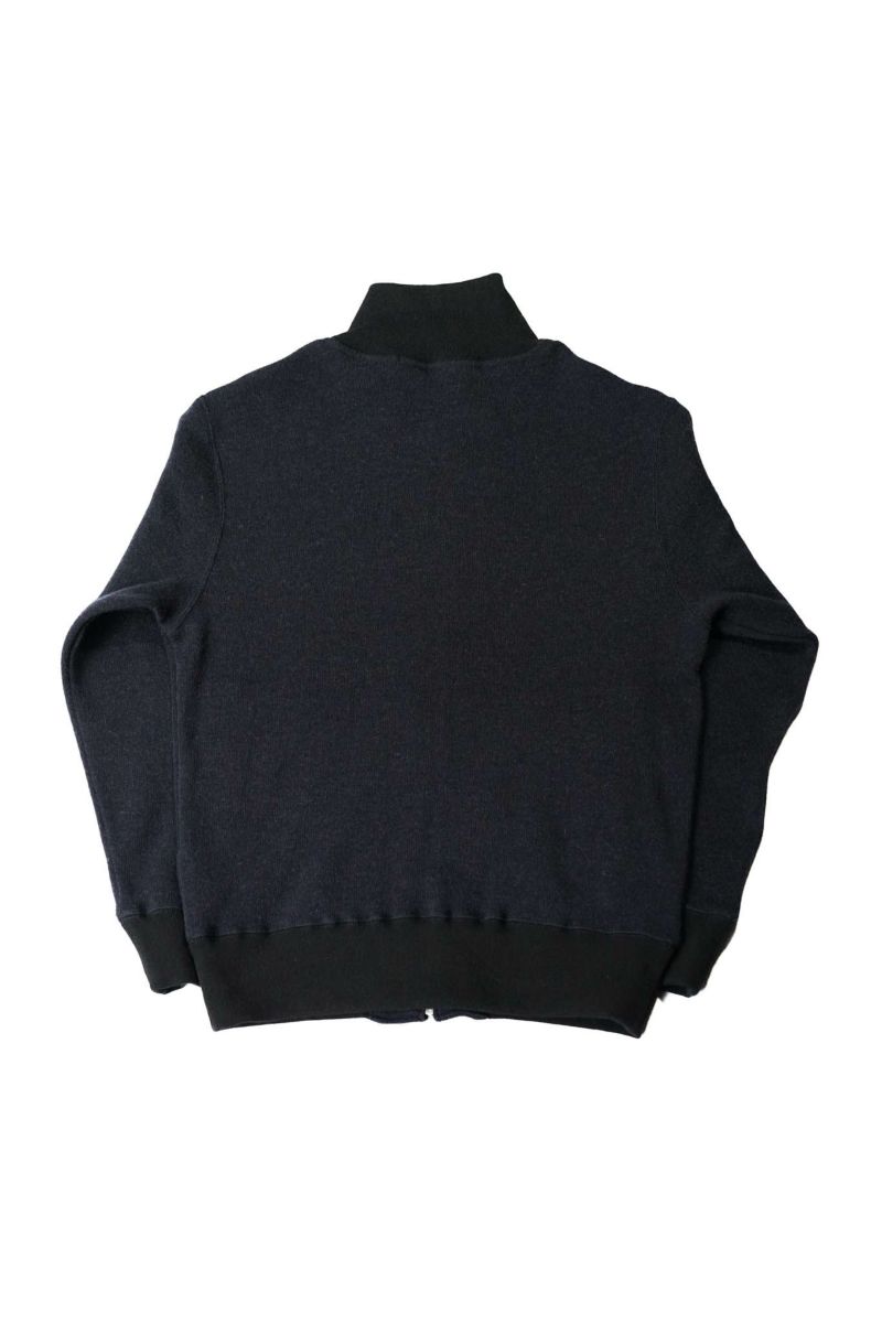 US NAVYのデッキジャケットがイメージソースのニットブルゾン。微妙な配色の差があるリブとのコンビネーションが魅力的です。素材は古着屋で偶然見つけた40〜50年代と思われるMADE IN USAのカーディガンを元に作られたオリジナルのもの。出来上がりの肉感に合わせて質感と共に最適な番手のウールを選定、カリカリに強撚し、糸を作り上げました。当時使われていた機械や作り方などが現在とは全く異なるため、制作において多くの試行錯誤を重ね出来上がった、渾身のプロダクトです。