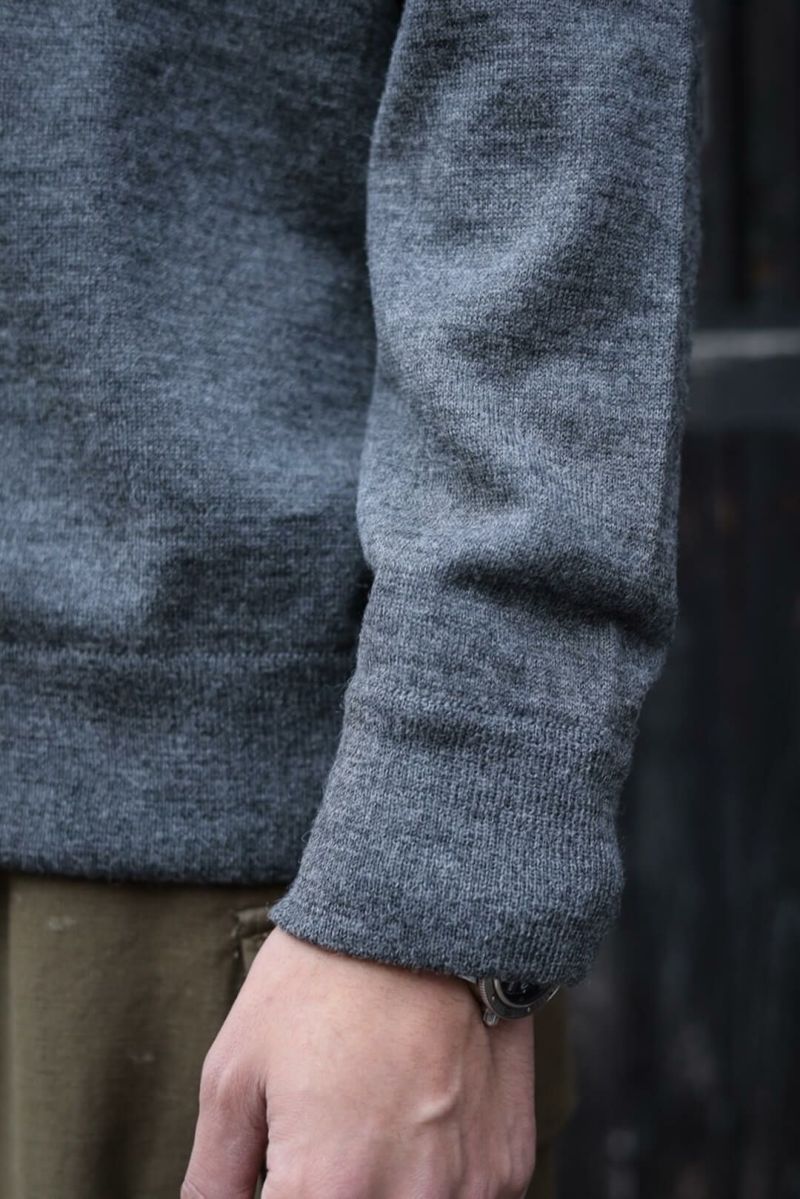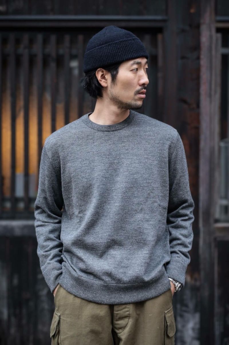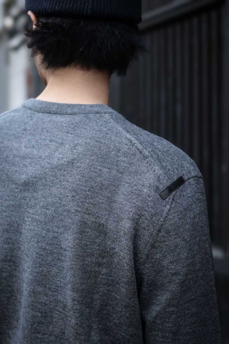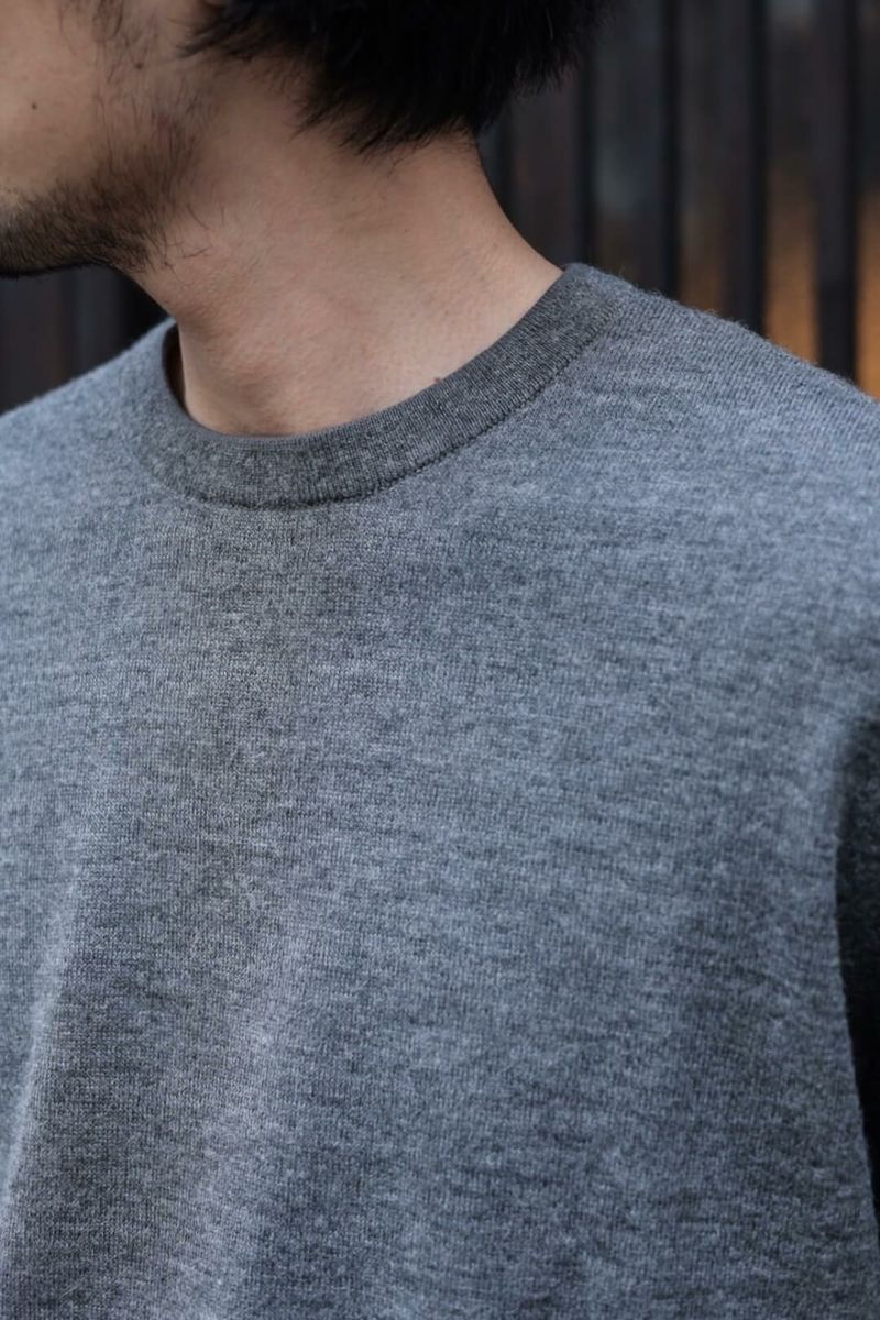 ベビーアルパカ100%のクルーネックセーター。高品質なベビーアルパカは着心地の良さはもちろん、保温性と発散性に優れています。寒い時には保温し、暑い時には発散する。まさしく天然の機能繊維です。補強のために施された、両肩と両袖のレザーパッチがさりげないアクセントになっています。幅広いスタイリングに合う、上品なアイテムです。