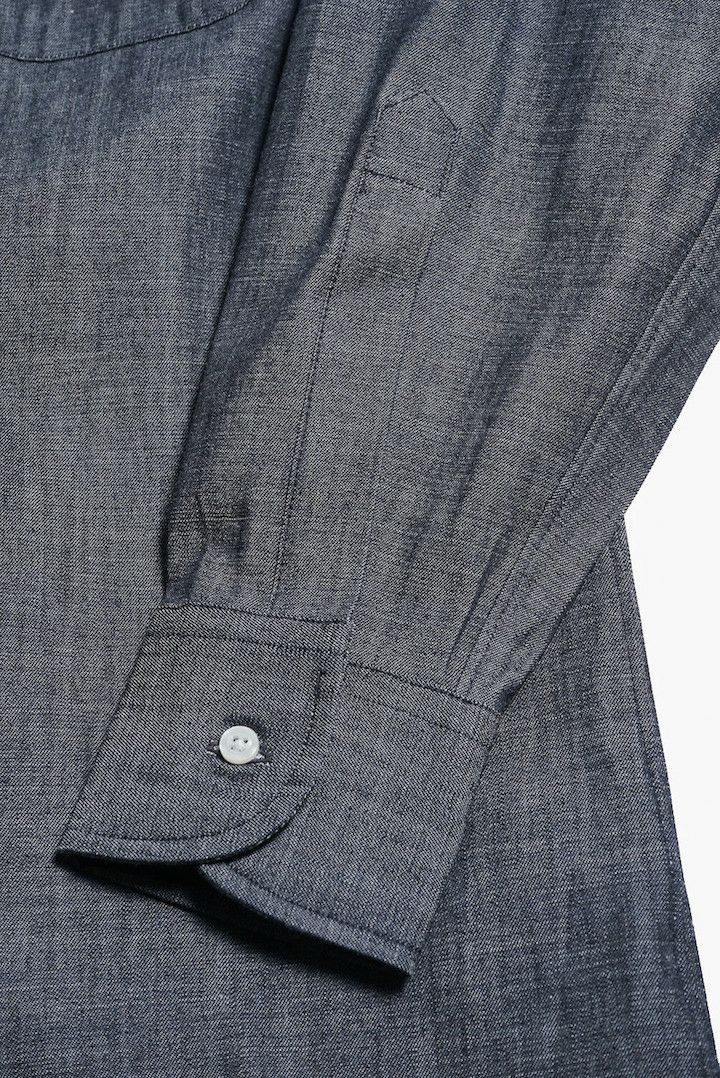 美しい襟のロールと、第1ボタンを外した際の首元の開き具合が絶妙です。さらに、胸ポケットはVの字にステッチが入った通称「Vヘム」ポケット、剣ボロのボタンを「無し」の仕様にすることで、クラシックでアメリカンなB.D.シャツを追求しました。