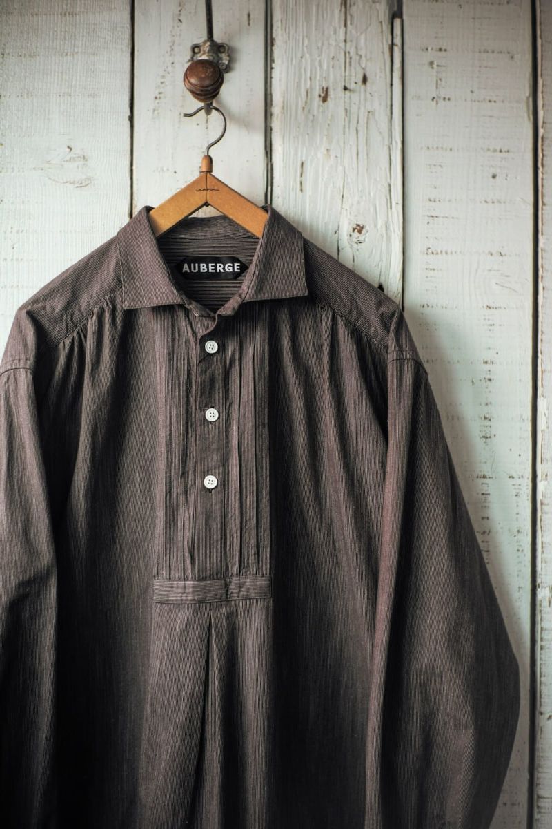 AUBERGE新作のHENRIは、フレンチヴィンテージに見られるBIAUDEのデザインをベースに、再構築した一枚です。当時のヴィンテージは、手作業で細かいギャザーを多く入れていましたが、そのディテールも再現しています。