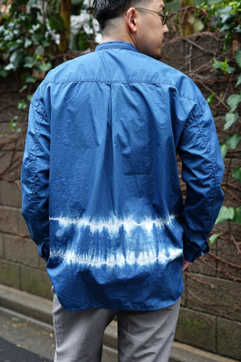 高密度に織り上げたサテン素材に、特殊なピーチ加工と素材の光沢を生かせるように加工したオリジナル素材です。インディゴの絞り染めが良い風合いを出しています。