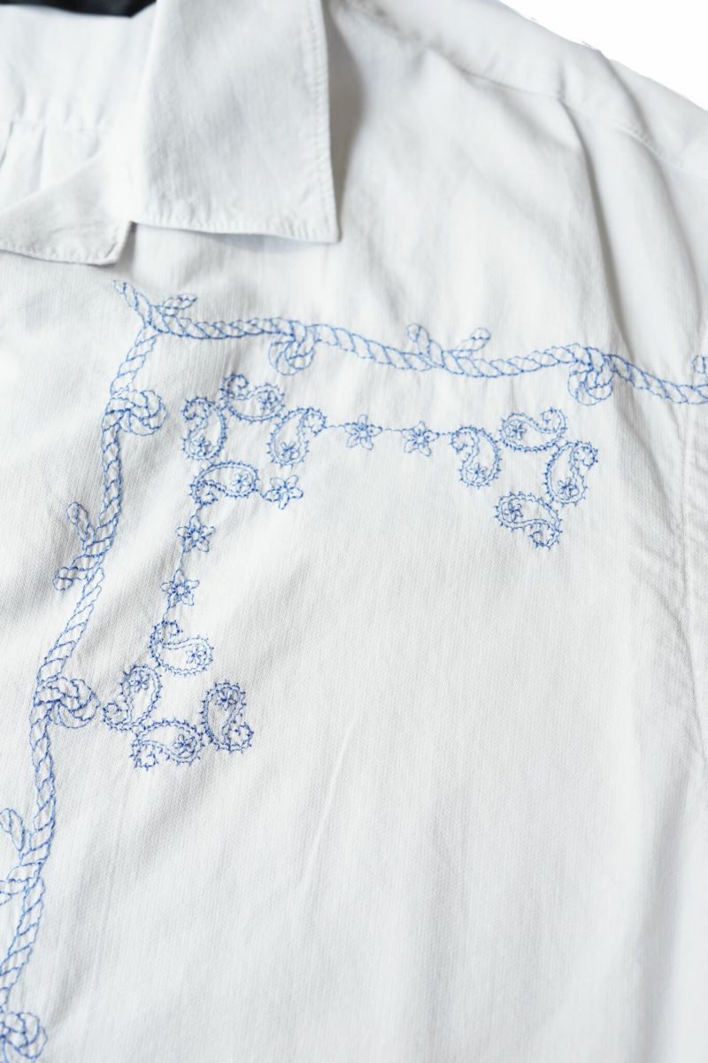 群馬・桐生においてバンダナ&マリン調な60年代コートダジュールをイメージしたパネル刺繍をが施されたシャツ。肌触り、肌離れの良い、比較的シワの気にならない表面感でカジュアルなシーンに最適なauberge完全オリジナルの素材です。シャツの形はBIRKINを開襟に改造した物です。シーズン立ち上がりから羽織もの感覚で着用いただきたい一着。