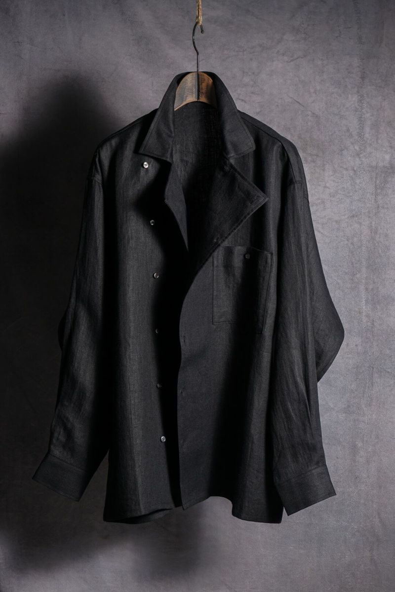フロントを閉めて着るも良し、開けてドレープ感を楽しむも良し、襟を折り返してジャケットのように着こなすのも良しと、様々な着方を楽しめる、他には無い一枚となっています。