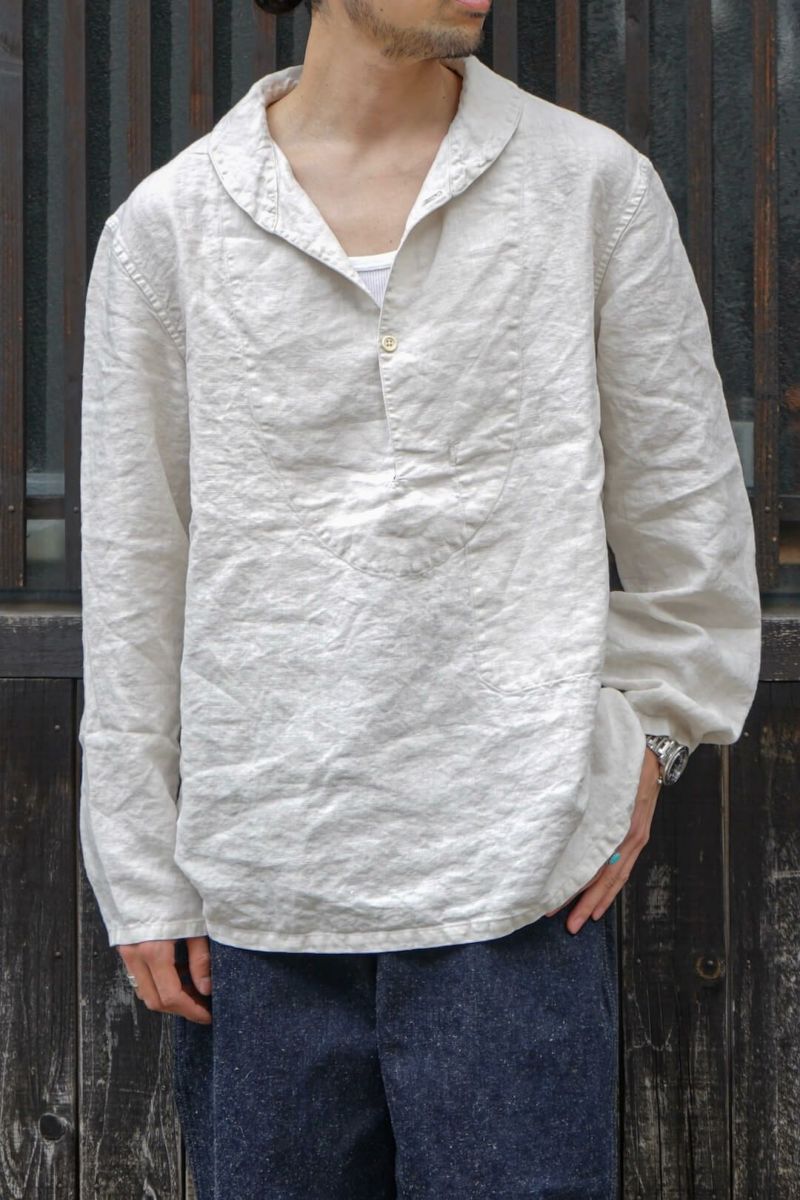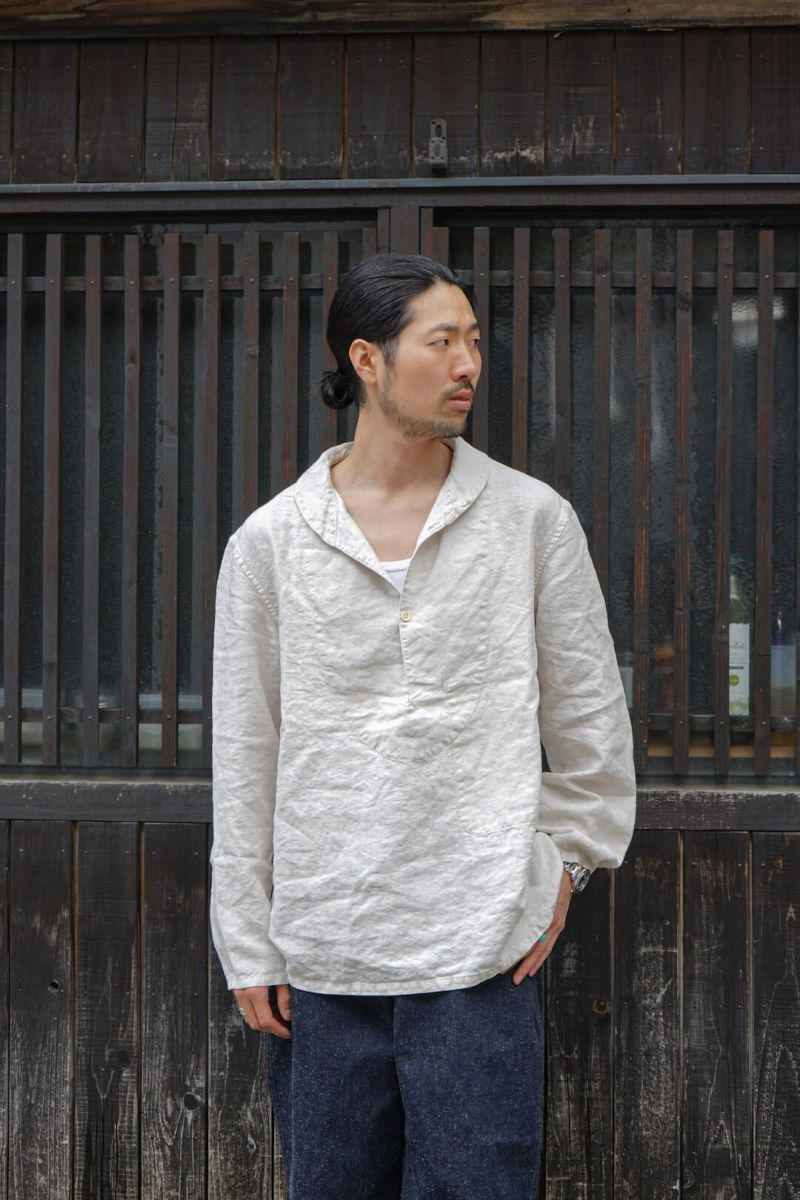長い年月を経て変化したリネン生地の色合い、風合いを忠実に再現することに着目した「Discoloration = 変色」シリーズのセーラーシャツ。