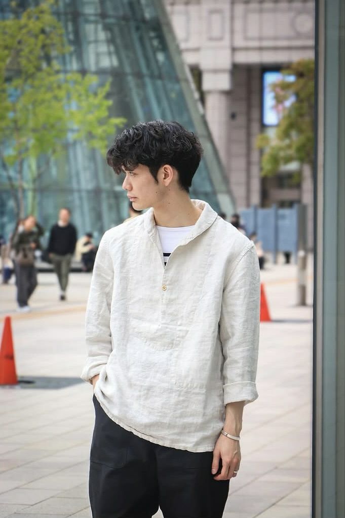 長い年月を経て変化したリネン生地の色合い、風合いを忠実に再現することに着目した「Discoloration = 変色」シリーズのセーラーシャツ。