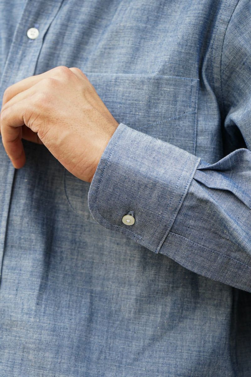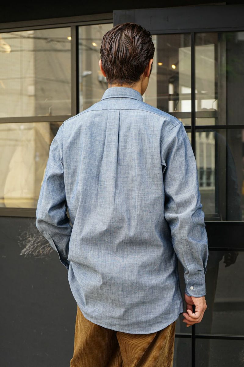美しい襟のロールと、第1ボタンを外した際の首元の開き具合が絶妙です。さらに、胸ポケットはVの字にステッチが入った通称「Vヘム」ポケット、剣ボロのボタンを「無し」の仕様にすることで、クラシックでアメリカンなB.D.シャツを追求しました。