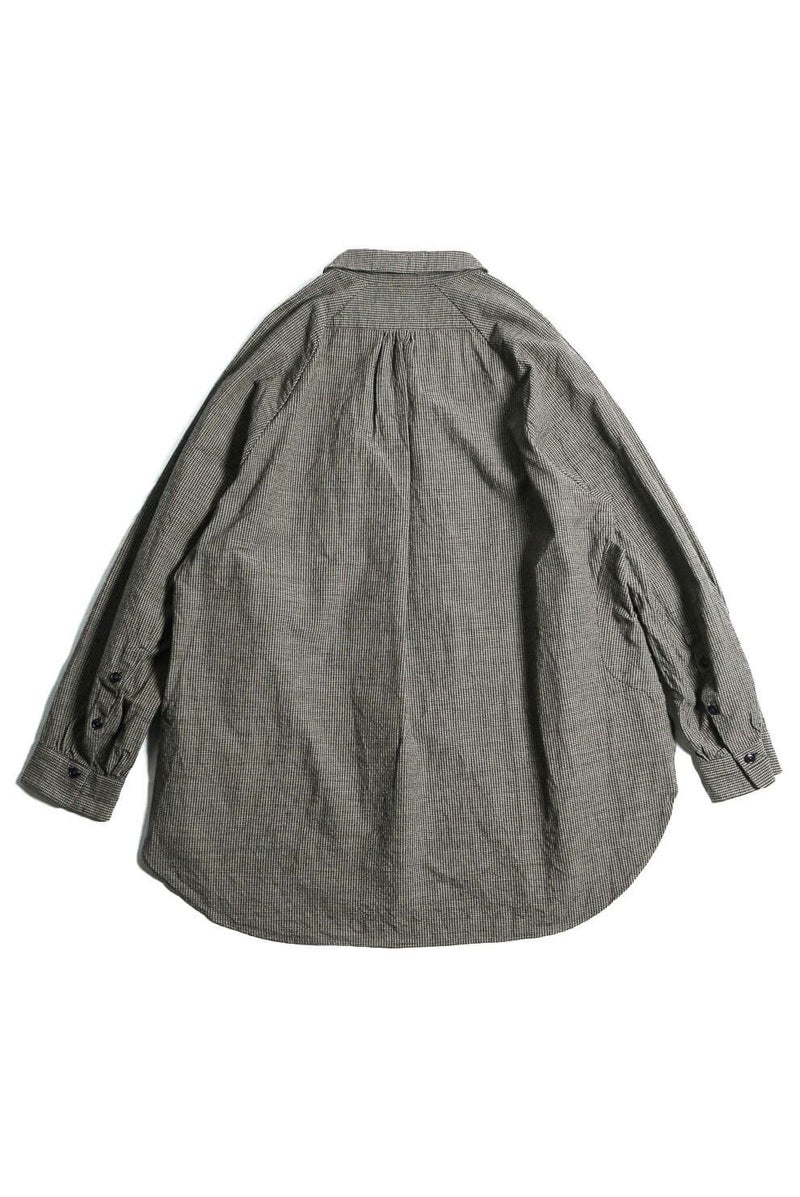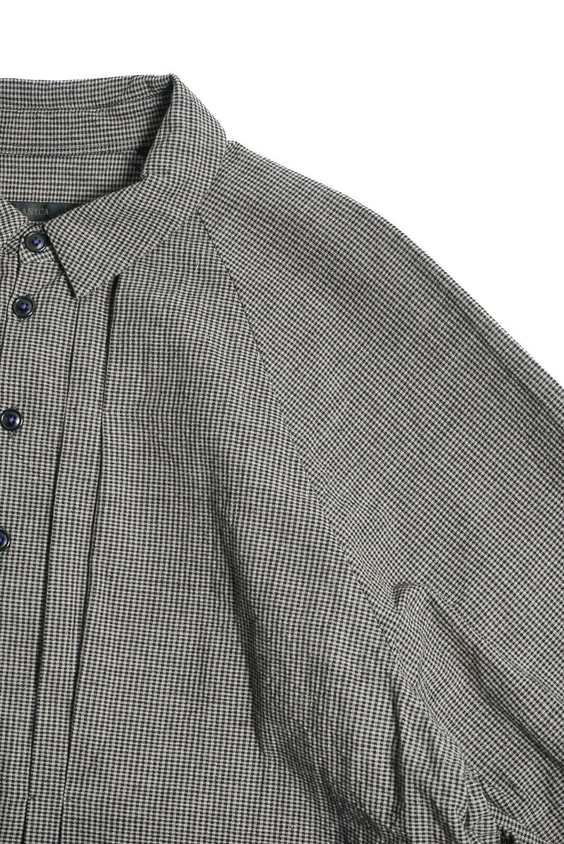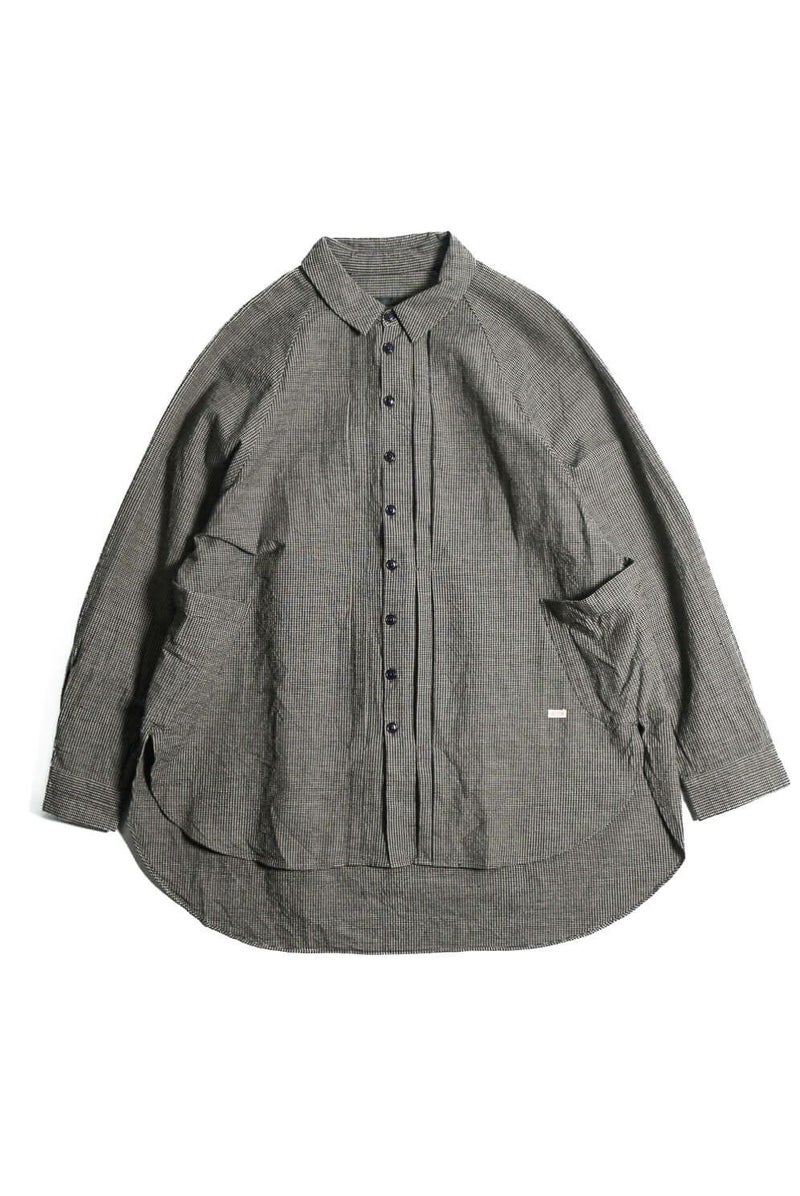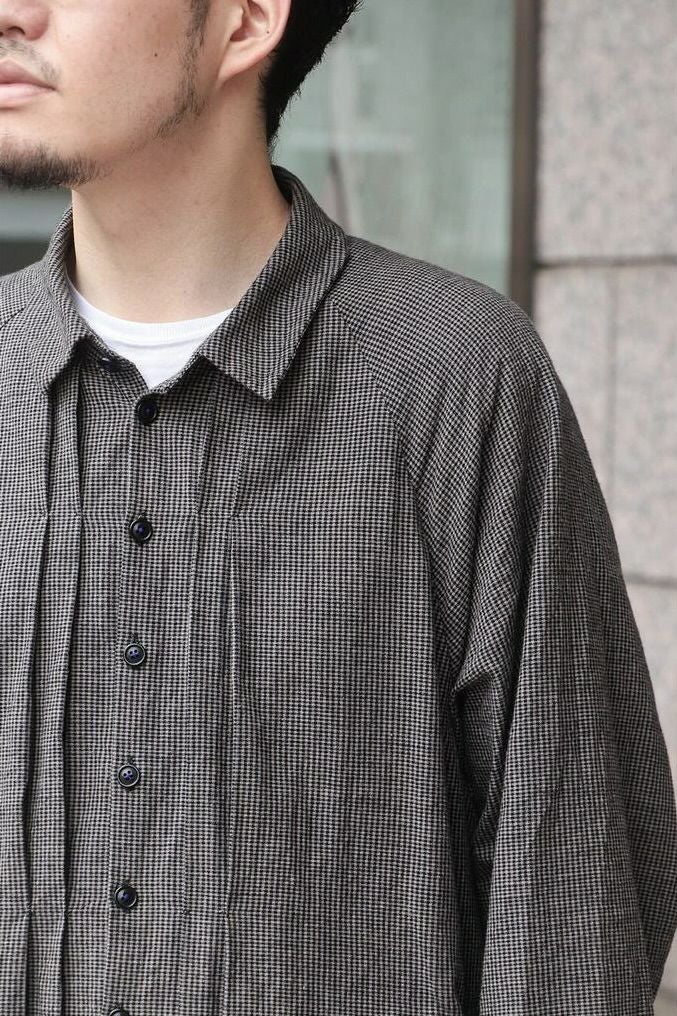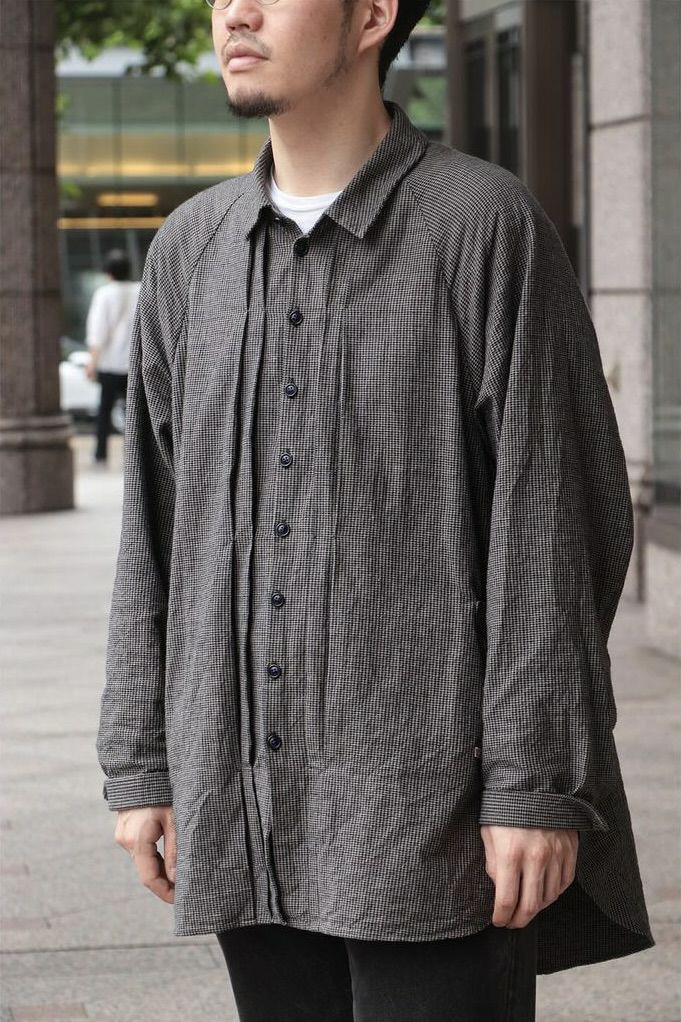 KLASICA(クラシカ) コンパクトなレギュラーカラーにバルーンシルエット、ラグランスリーブにフロントのプリーツ、脇のパッチポケットなど、特徴的なデザインが満載の1着。シャツとしてもライトアウターとしても活躍してくれます。 素材は、微妙なグレー2色に染め分けた糸とブラックを掛け合わせて、アンティークマットの日焼けした色味を目指したコットンギンガム生地。明るいイメージのギンガムを奥行きのある重いトーンで印象を変えています。ワッシャー仕上げ。独自の凹凸感は緩やかな織機で折り上げるで表現されています。 <素材> COTTON 100% KLASICA / "SH 043" GH PRICE ¥59,620(税込み) 品番 : 24F・SH43・C22