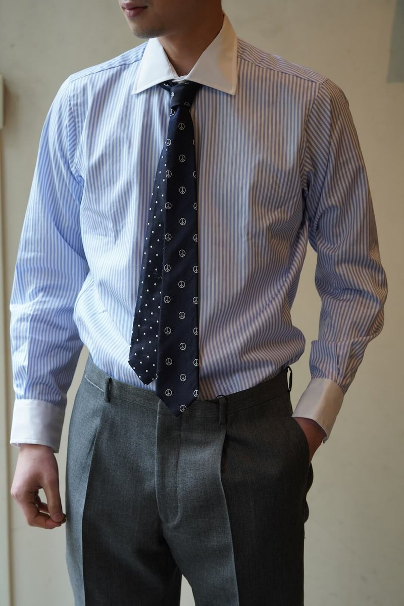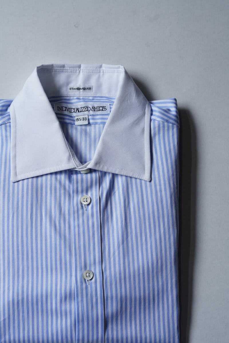 アメリカの老舗カスタムシャツメーカーINDIVIDUALIZED SHIRTSに別注依頼して製作したシャツ。英国的なワイドスプレッドカラーのクレリック(セパレートカラー)シャツをあえてアメリカのファクトリーで仕上げた1枚はドレススタイルに最適です。