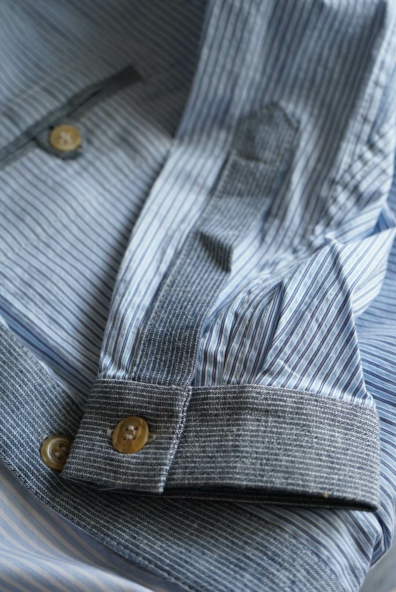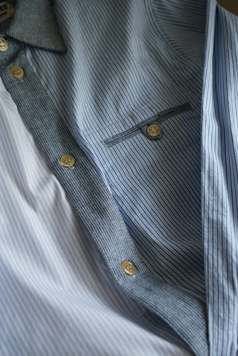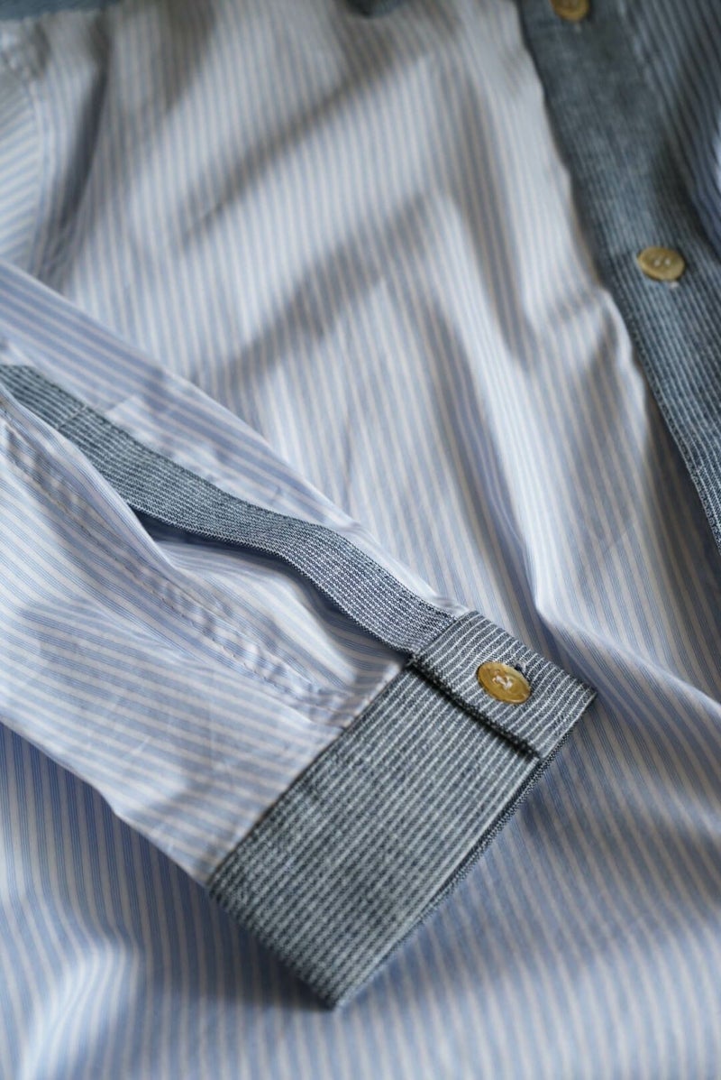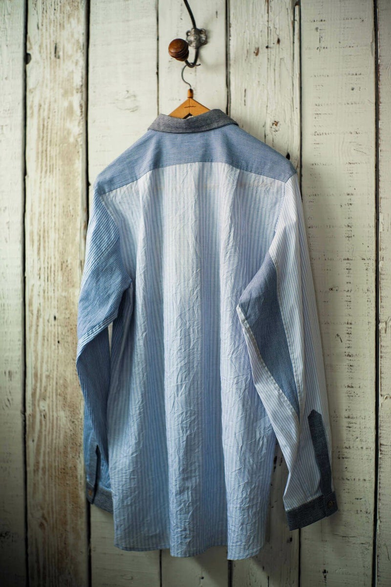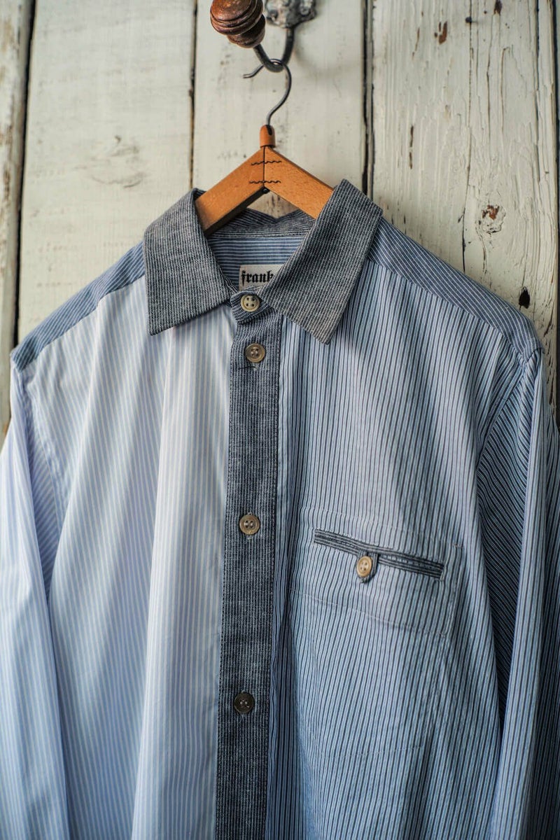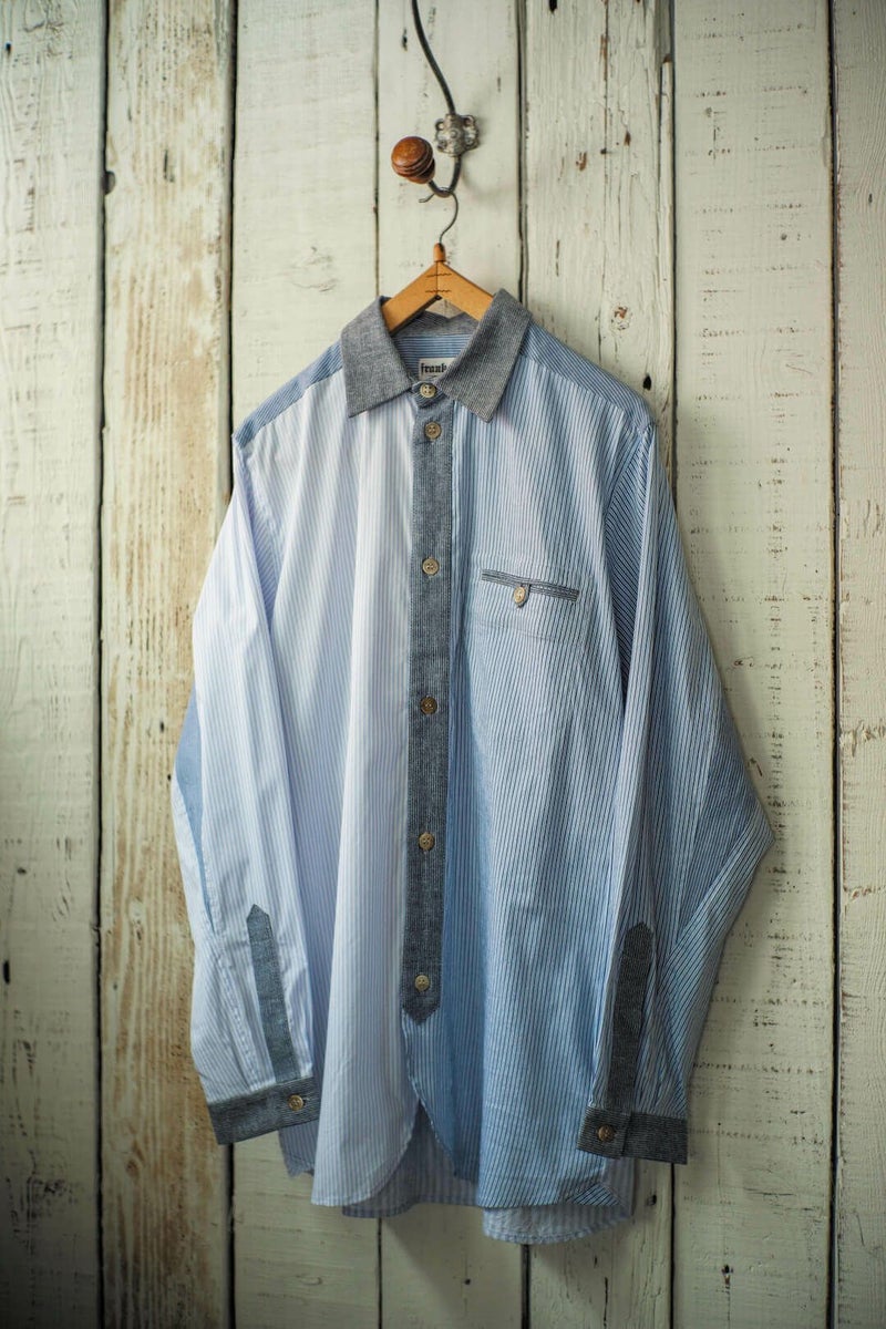 FRANK LEDER VINTAGE FABRIC EDTION。 過去のコレクションにて使用していたヴィンテージのファブリックを贅沢に使用し、クレイジーパターンにて制作されたシャツ。 ブロードのブルーストライプの生地をメインに、様々な生地が組み合わさった一枚は、迫力のある仕様に仕上がっています。 ヨーロッパの古いドレスシャツに使われていたであろう、上質な生地は肌触りが良く、洗いをかけて着たくなります。 COTTON 100%