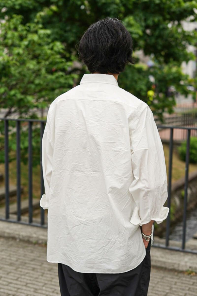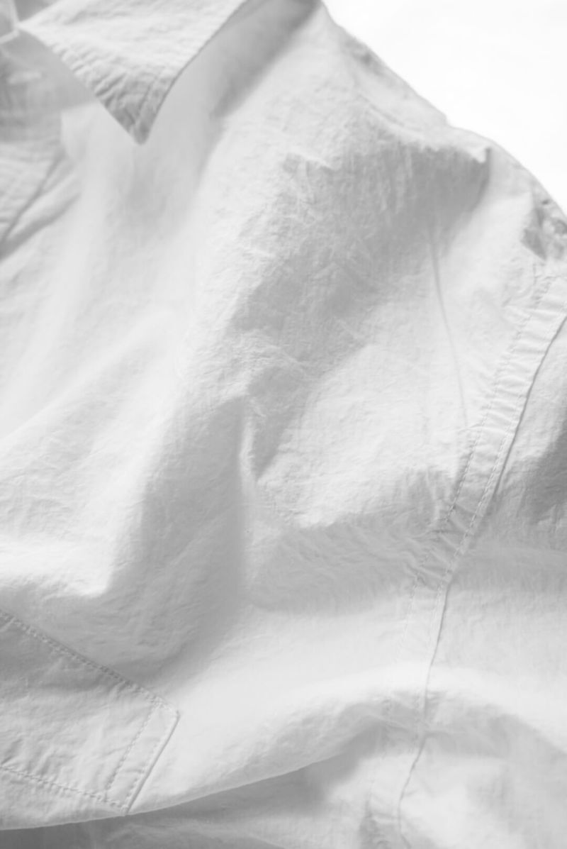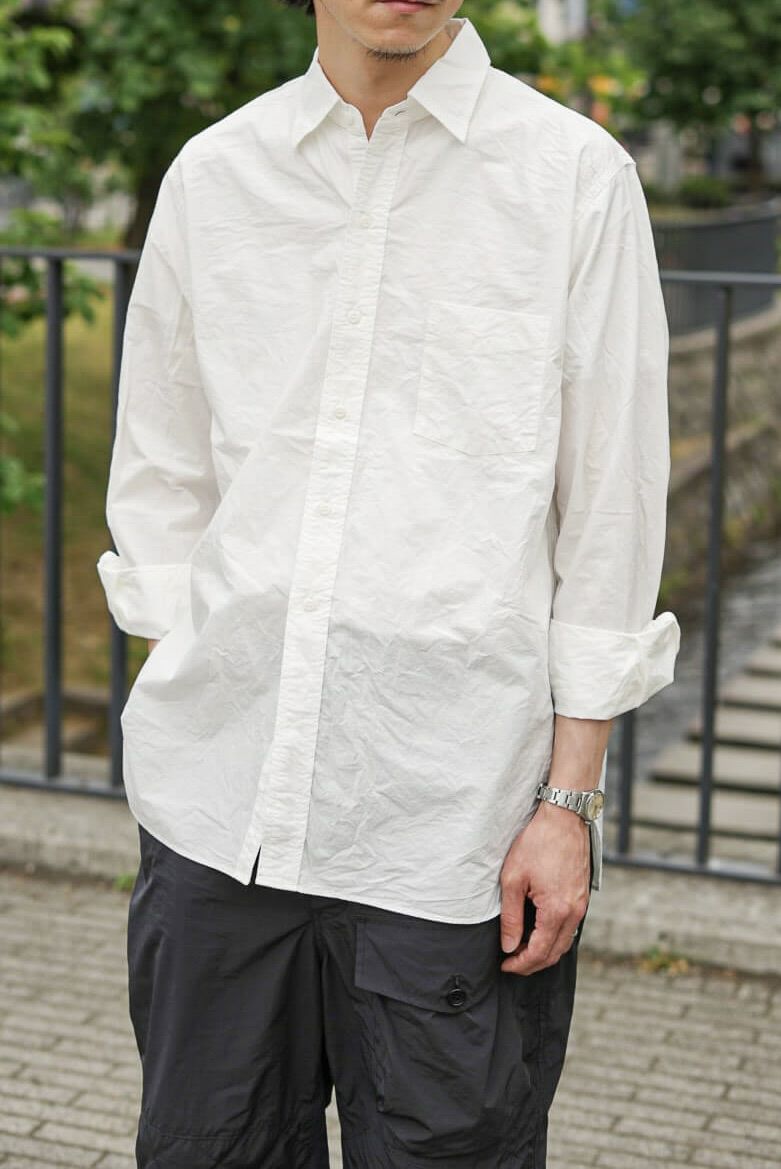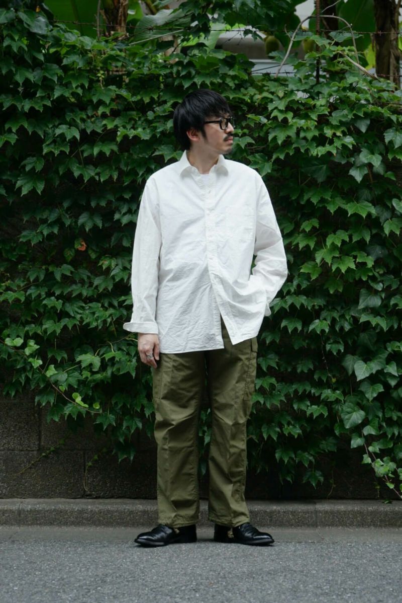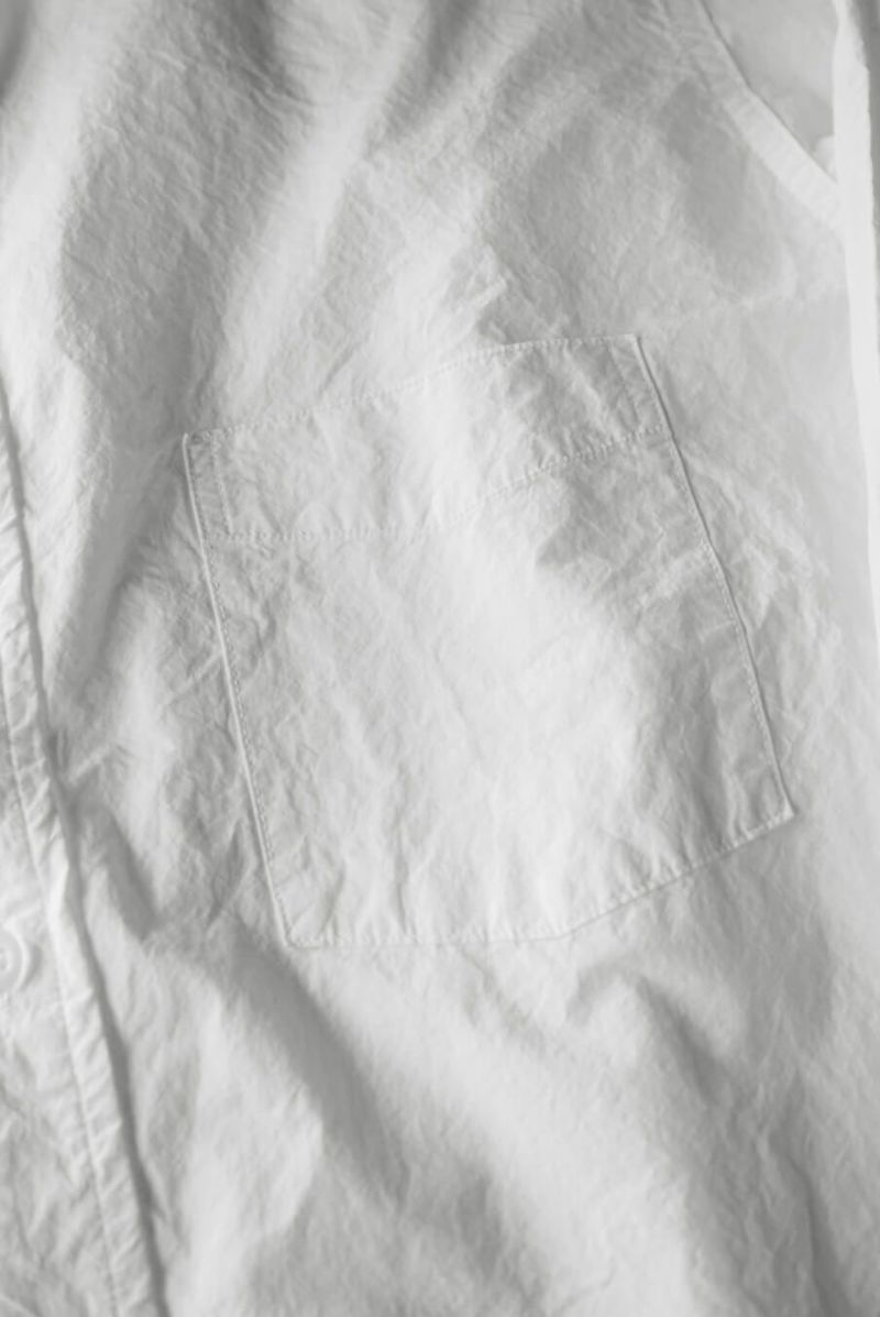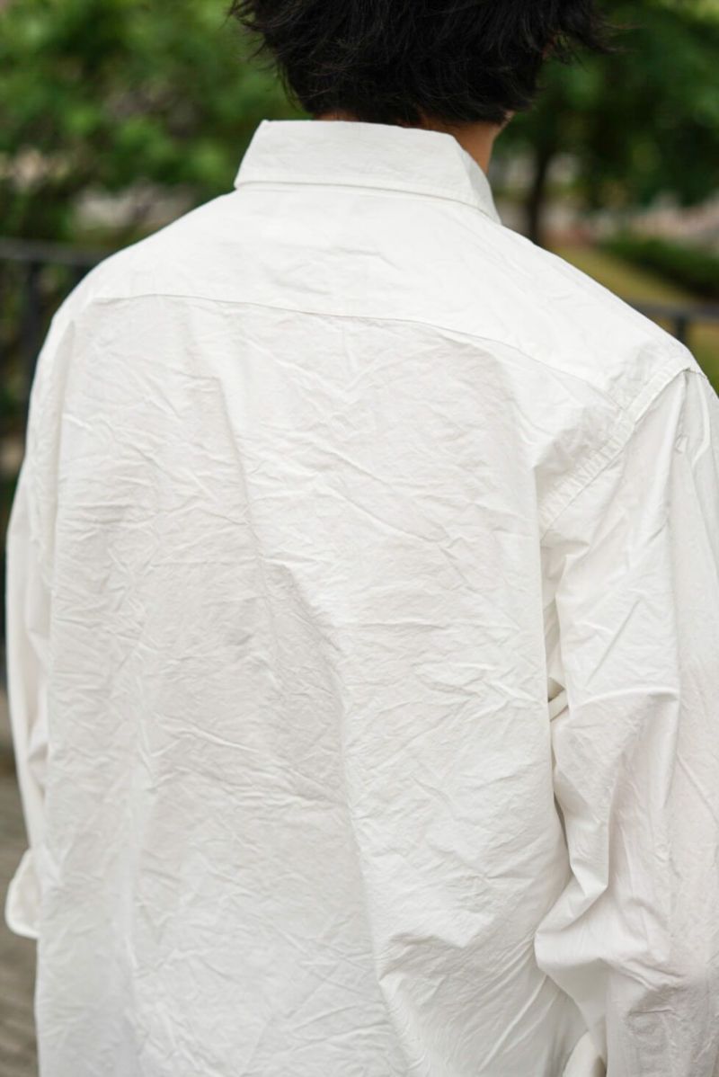 それに加えて、当時のミリタリースペック同様の縫製を用いることにより独自のシワ感とパッカリングが生まれ、膨らみのある繊細な生地感と無骨さを共存させた、他には無いシャツに仕上がりました。