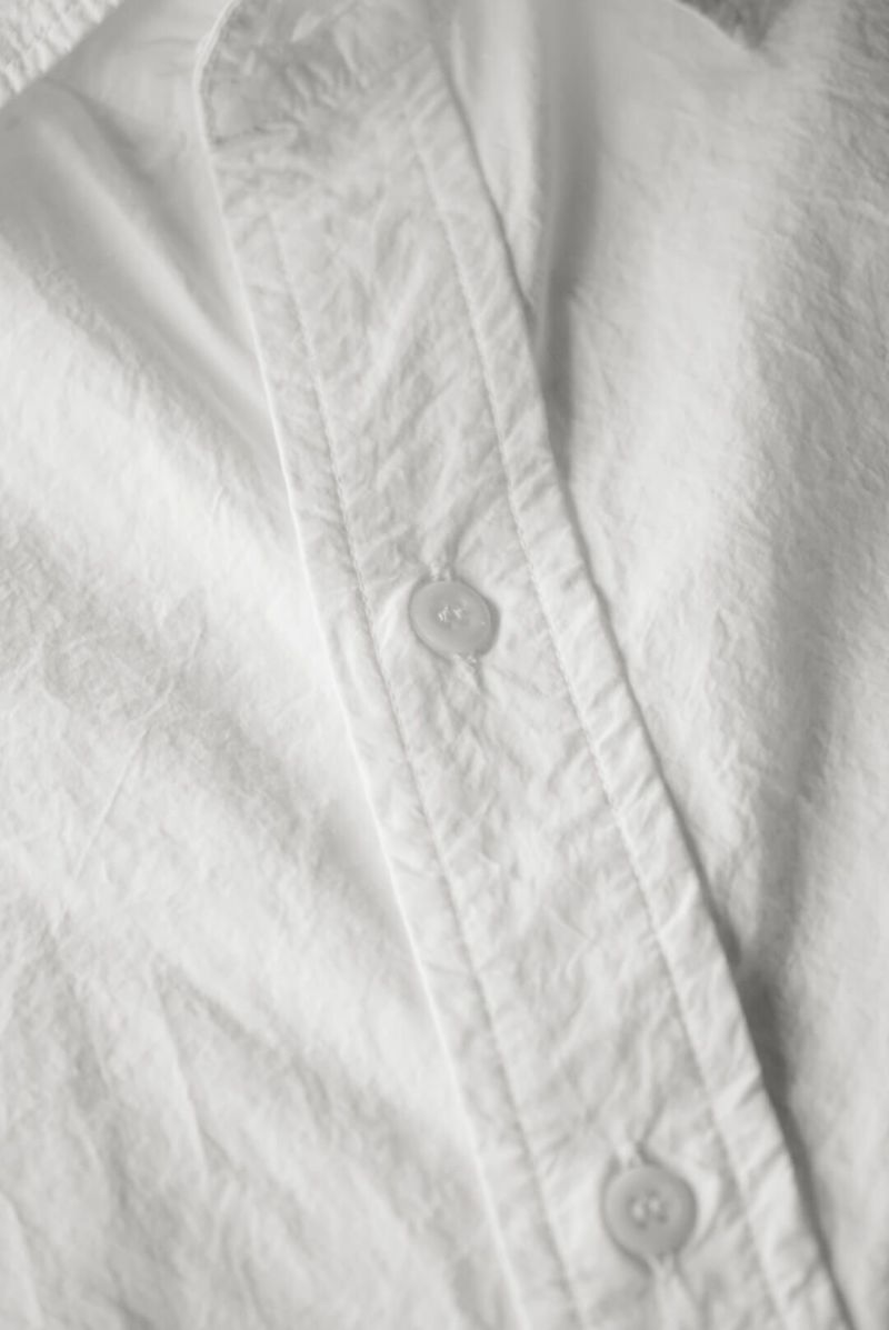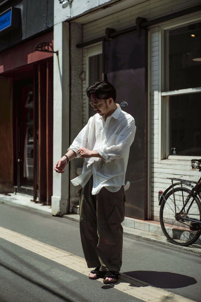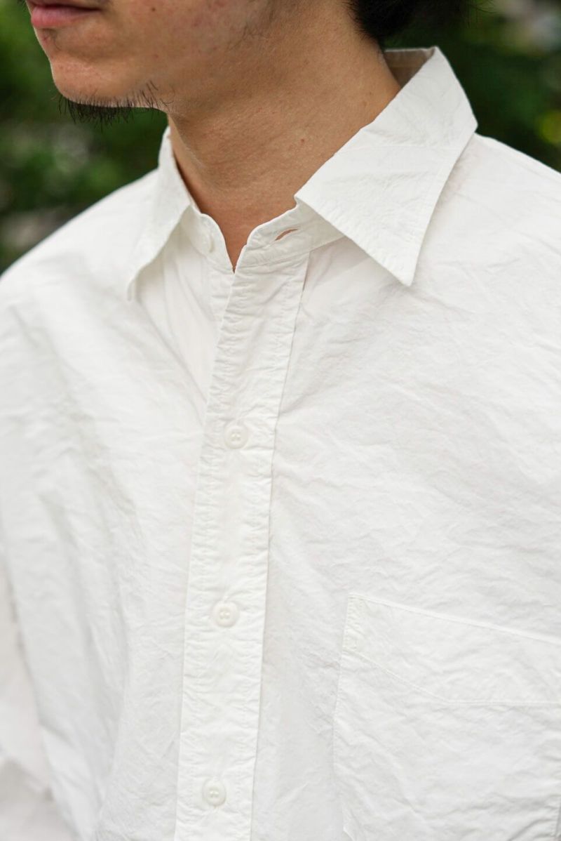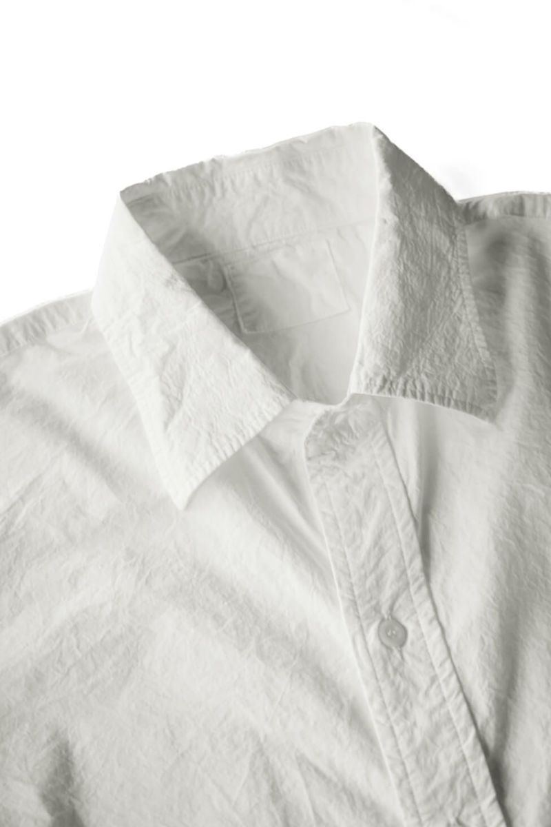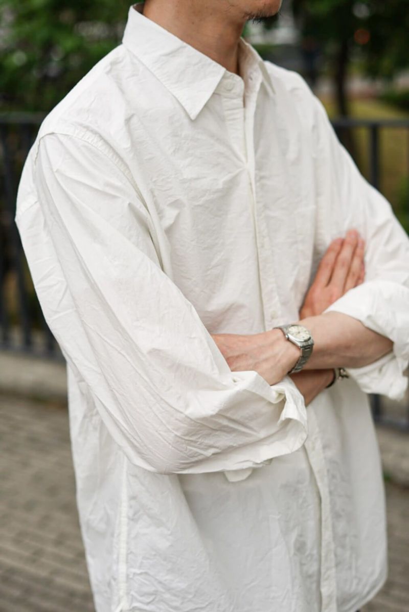 それに加えて、当時のミリタリースペック同様の縫製を用いることにより独自のシワ感とパッカリングが生まれ、膨らみのある繊細な生地感と無骨さを共存させた、他には無いシャツに仕上がりました。