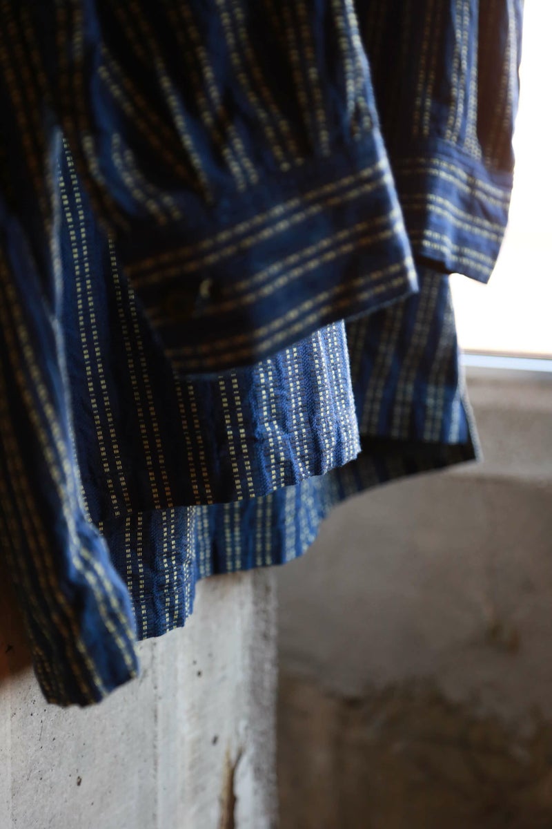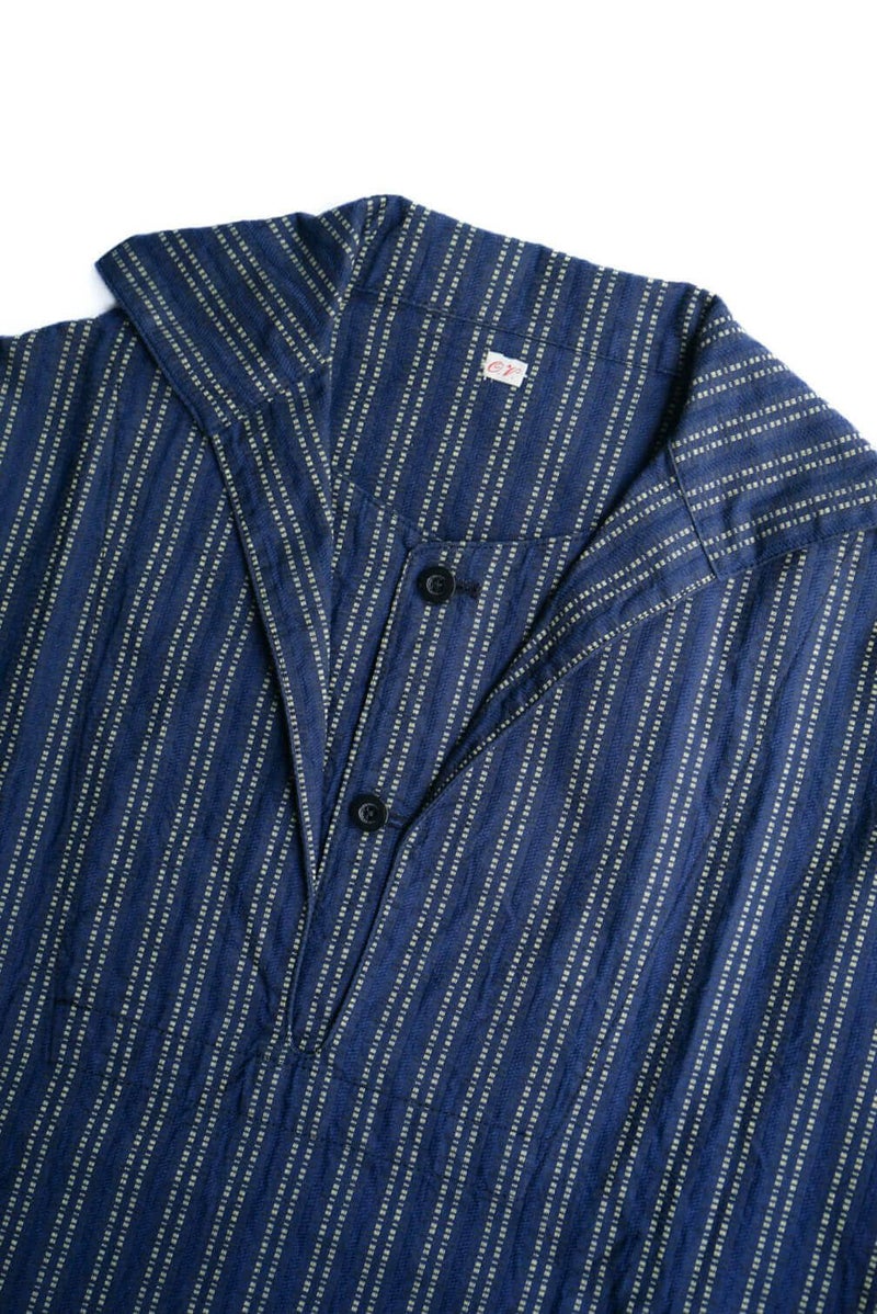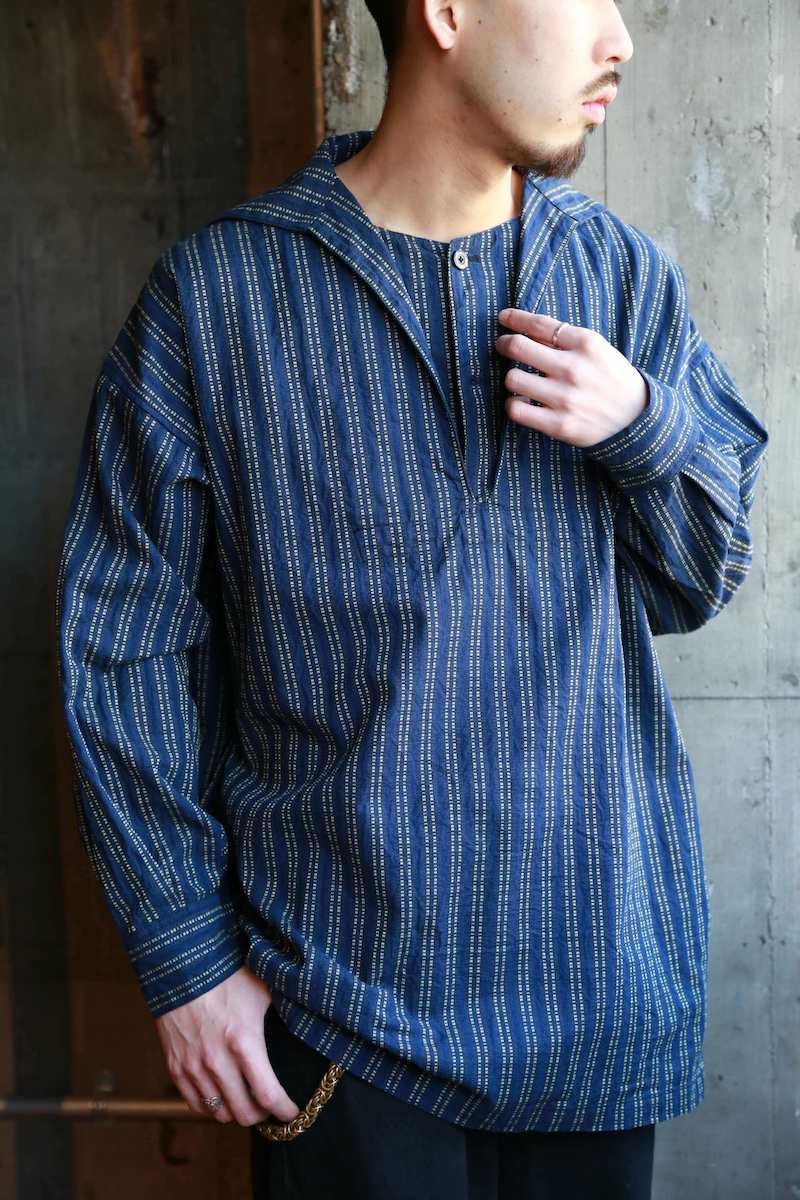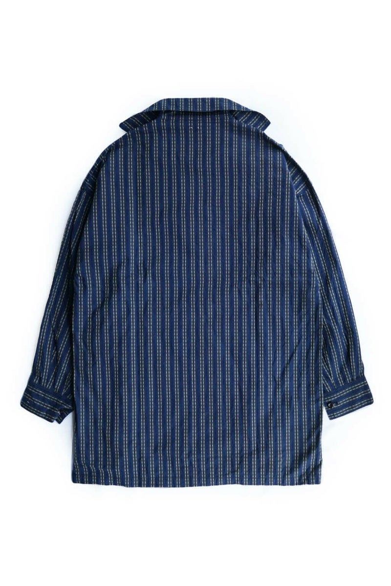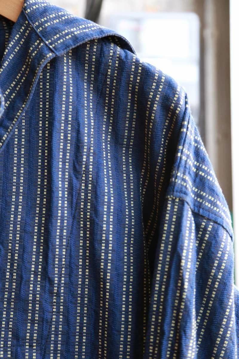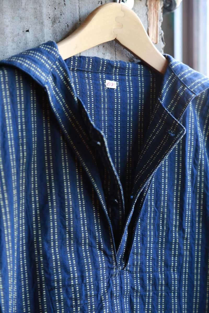 ヴィンテージのスキージャケットをベースにしたアイテム。前立てが特徴的で、開き部分にはボタン留めのフラップを施したレイヤードデザインに仕上げられています。古い年代の織り柄を元に独自に再構築されたインディゴストライプ生地は、色味の異なる糸で繊細に織り上げており、凹凸を感じる表情豊かな素材。洗い込む事でインディゴの経年変化も味わえます。