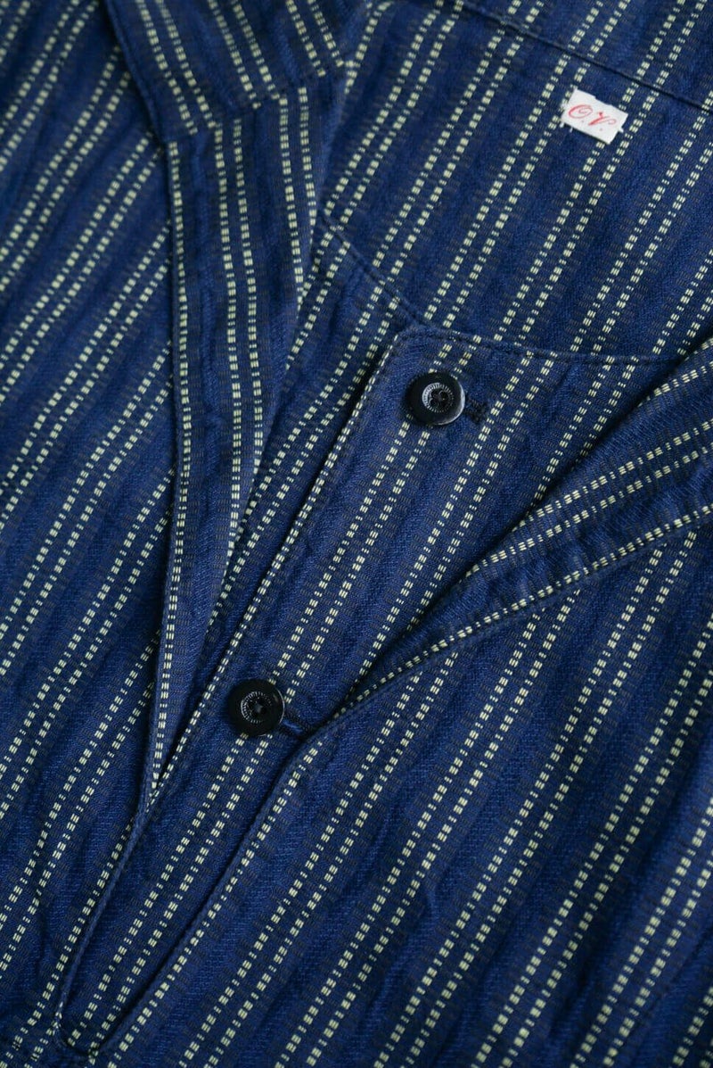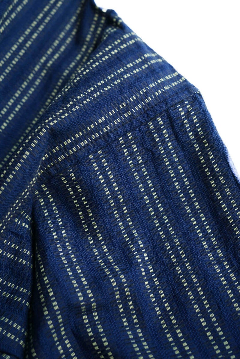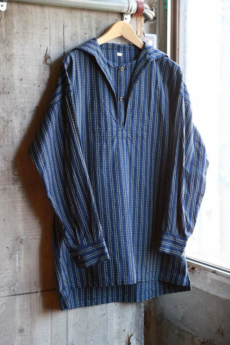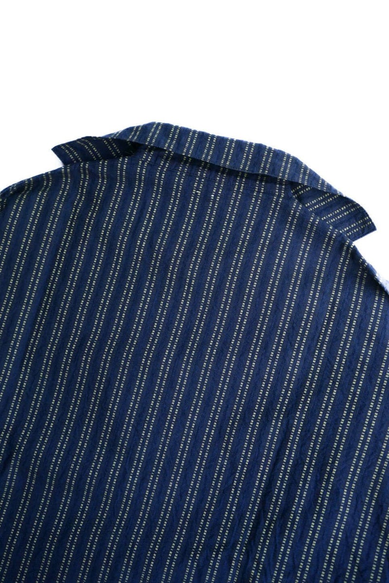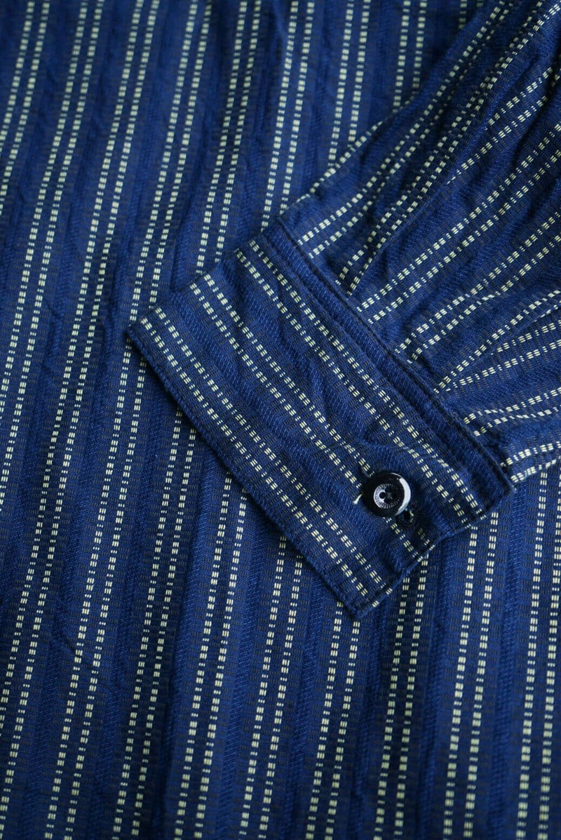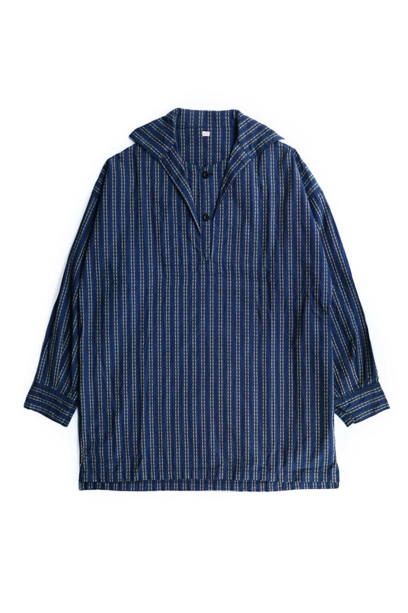 ヴィンテージのスキージャケットをベースにしたアイテム。前立てが特徴的で、開き部分にはボタン留めのフラップを施したレイヤードデザインに仕上げられています。古い年代の織り柄を元に独自に再構築されたインディゴストライプ生地は、色味の異なる糸で繊細に織り上げており、凹凸を感じる表情豊かな素材。洗い込む事でインディゴの経年変化も味わえます。
