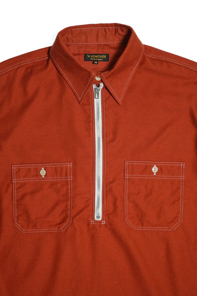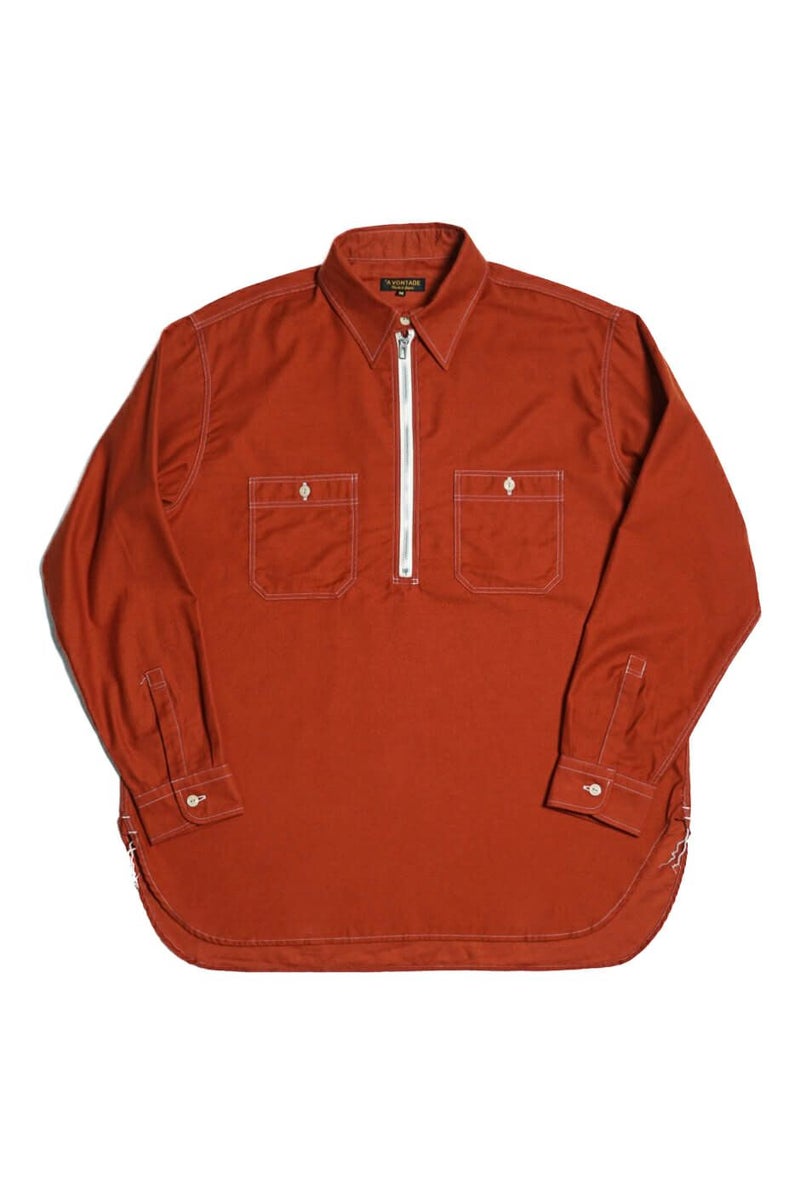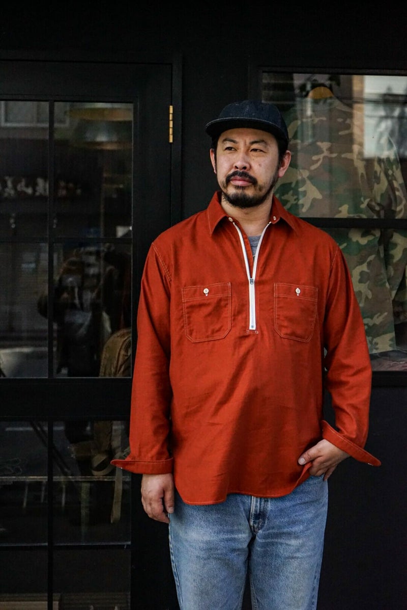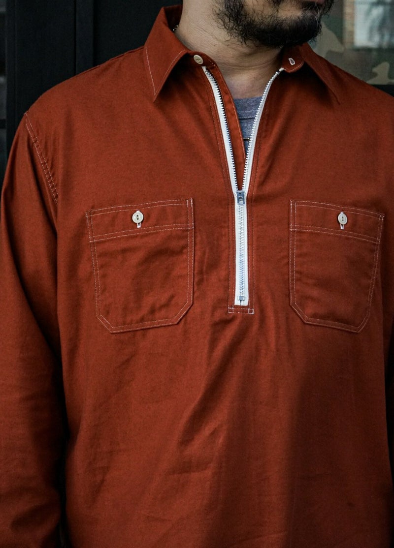 50年代のワークシャツをイメージソースにデザインされたハーフジッププルオーバーシャツです。素材はライトウェイトに織り上げたミリタリーツイル地にきめ細かい起毛加工を施したコットンスウェード地を採用。逆Rを描いた衿型、チンスト仕様の台衿や前立て付きのフロントなどは当時の仕様をオマージュしています。当時のシャツを参考に細番手の綿糸を使い、0.48mmの細巾の環縫いミシンを使用して運針を細かく丁寧に仕上げました。Waldes社のピンロックアルミジップを採用。着脱しやすいよう、身巾にゆとりを持たせたシルエットです。