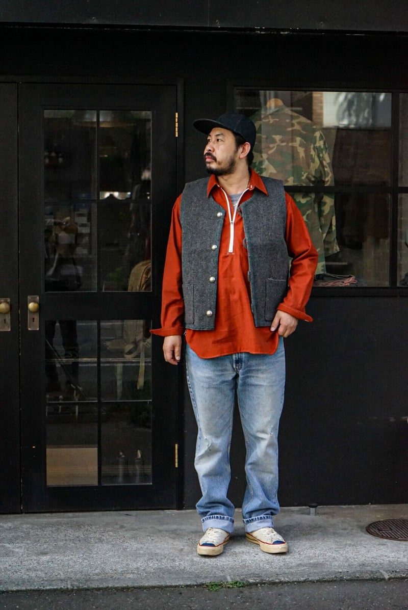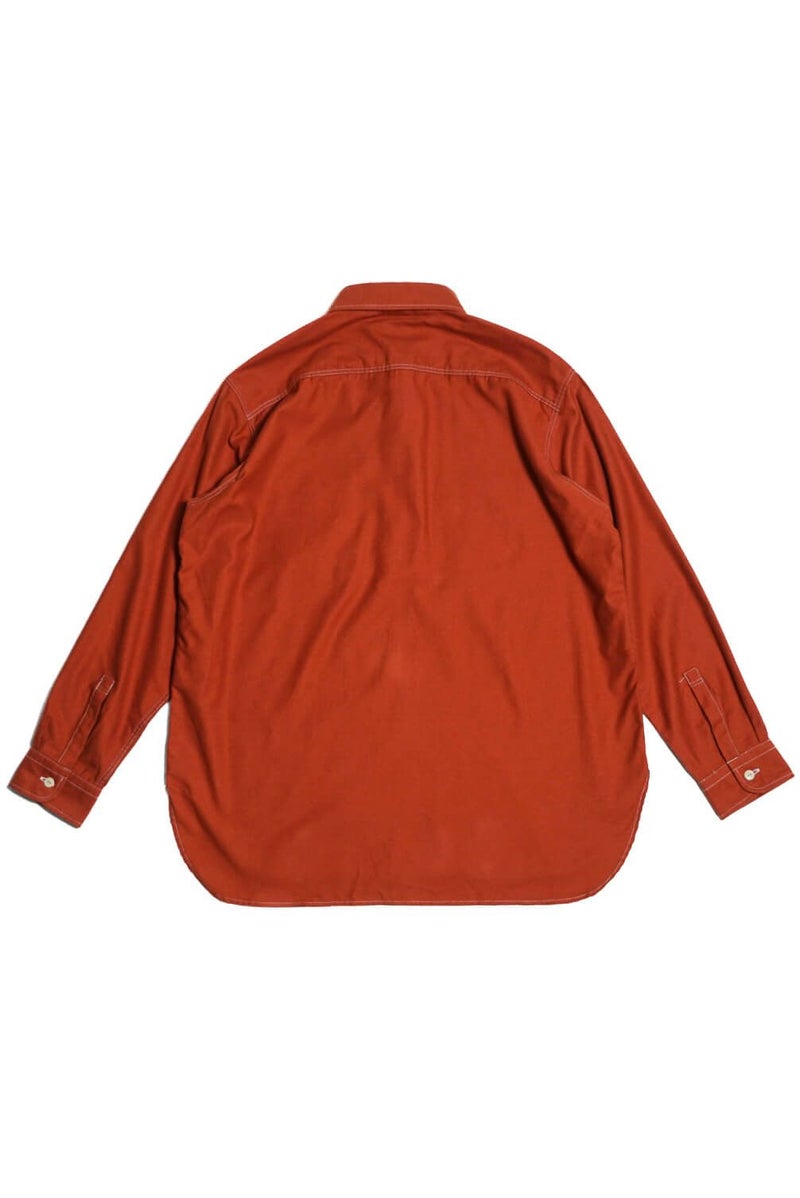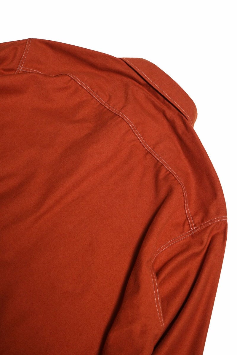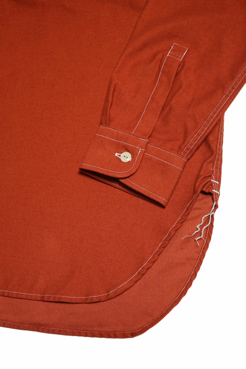 50年代のワークシャツをイメージソースにデザインされたハーフジッププルオーバーシャツです。素材はライトウェイトに織り上げたミリタリーツイル地にきめ細かい起毛加工を施したコットンスウェード地を採用。逆Rを描いた衿型、チンスト仕様の台衿や前立て付きのフロントなどは当時の仕様をオマージュしています。当時のシャツを参考に細番手の綿糸を使い、0.48mmの細巾の環縫いミシンを使用して運針を細かく丁寧に仕上げました。Waldes社のピンロックアルミジップを採用。着脱しやすいよう、身巾にゆとりを持たせたシルエットです。