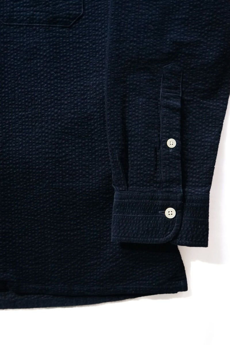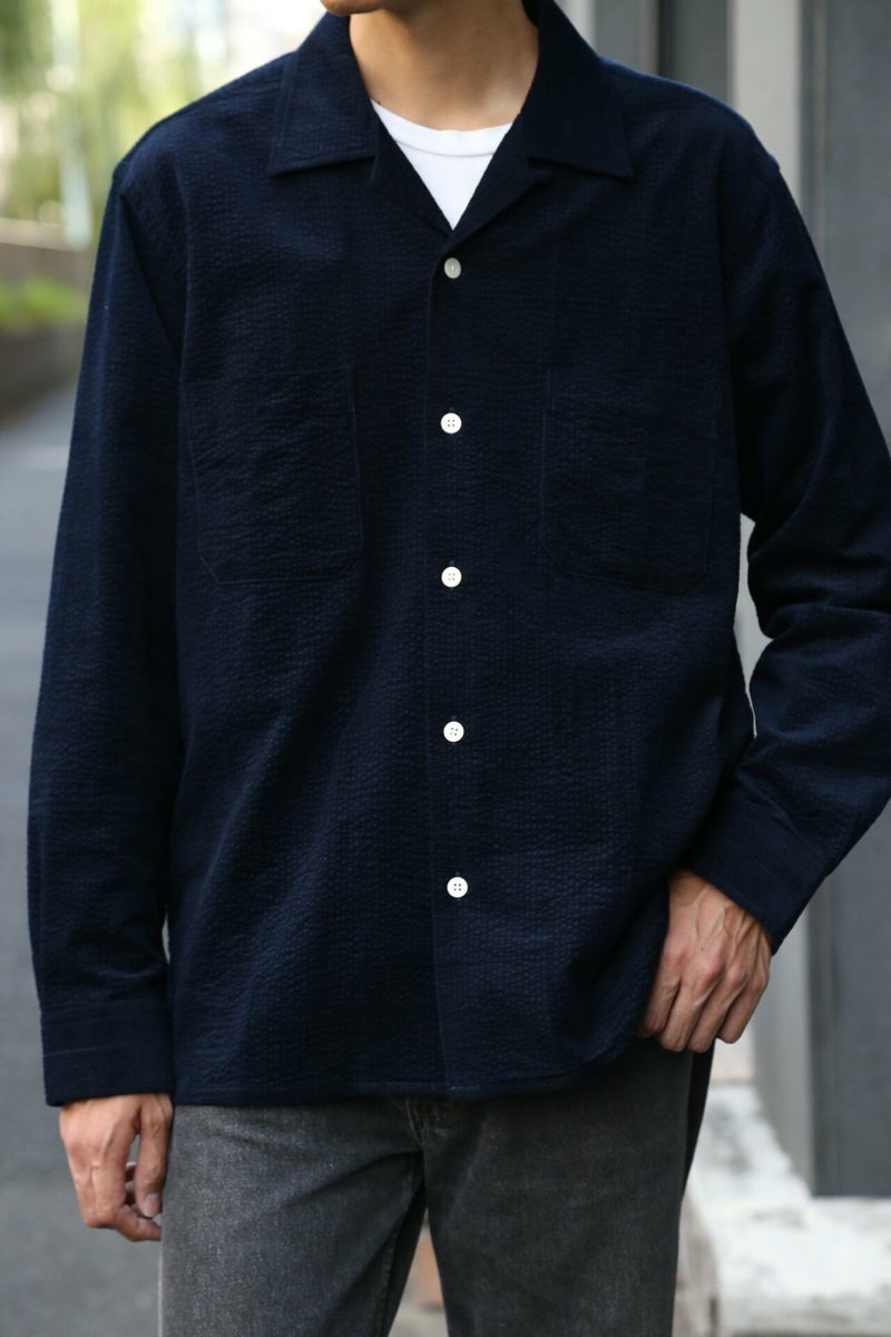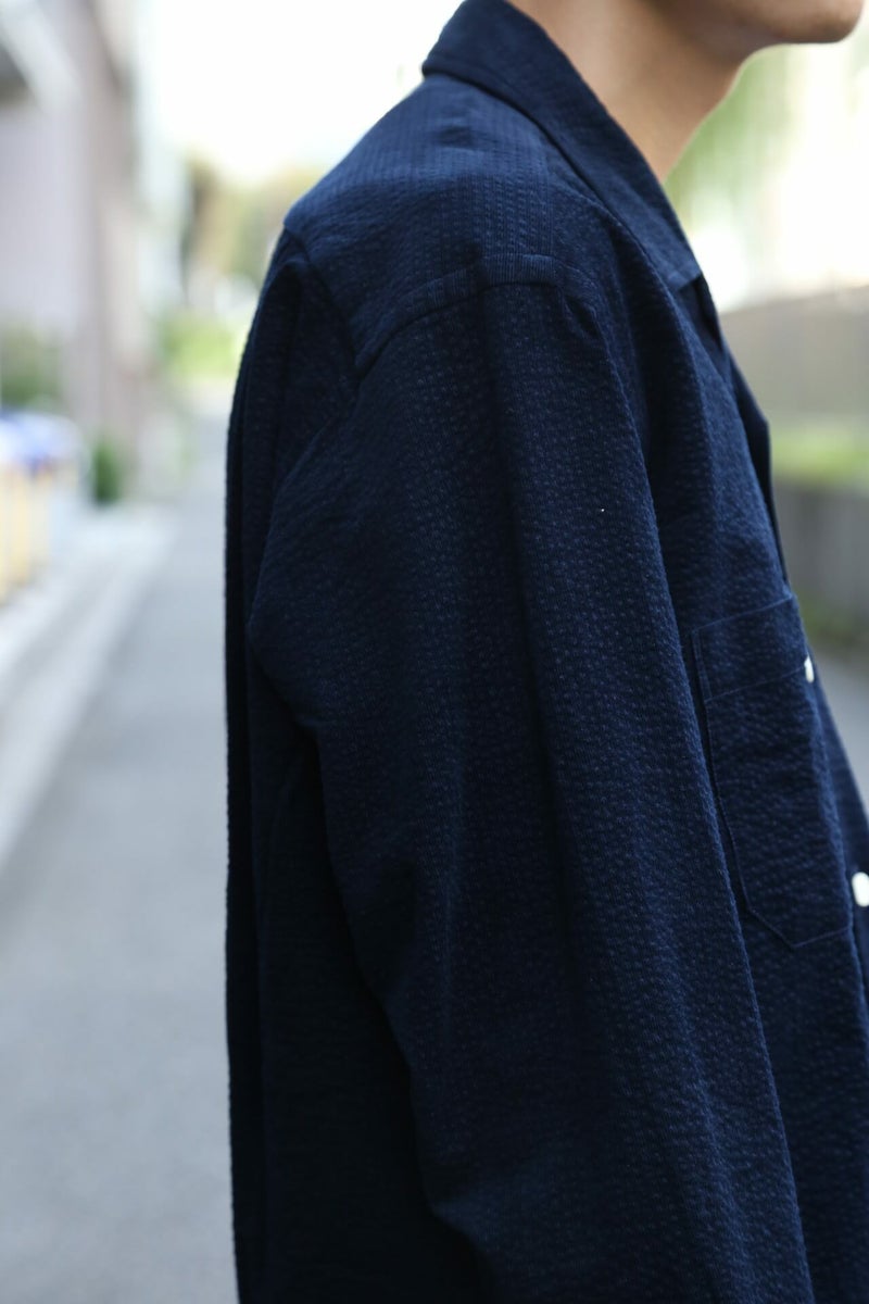 シアサッカーとコーデュロイを合わせたような、リップルコードという素材を使用。『Ripple(リップル)=さざ波』 という意味で、タテ方向に走る細畝のコーデュロイに対してヨコ方向にでている畝が特徴です。“MOJITO”の大定番アイテム”ABSHINTH SHIRT”ですがリップルコードの生地感で、また全然違った印象の一枚です。