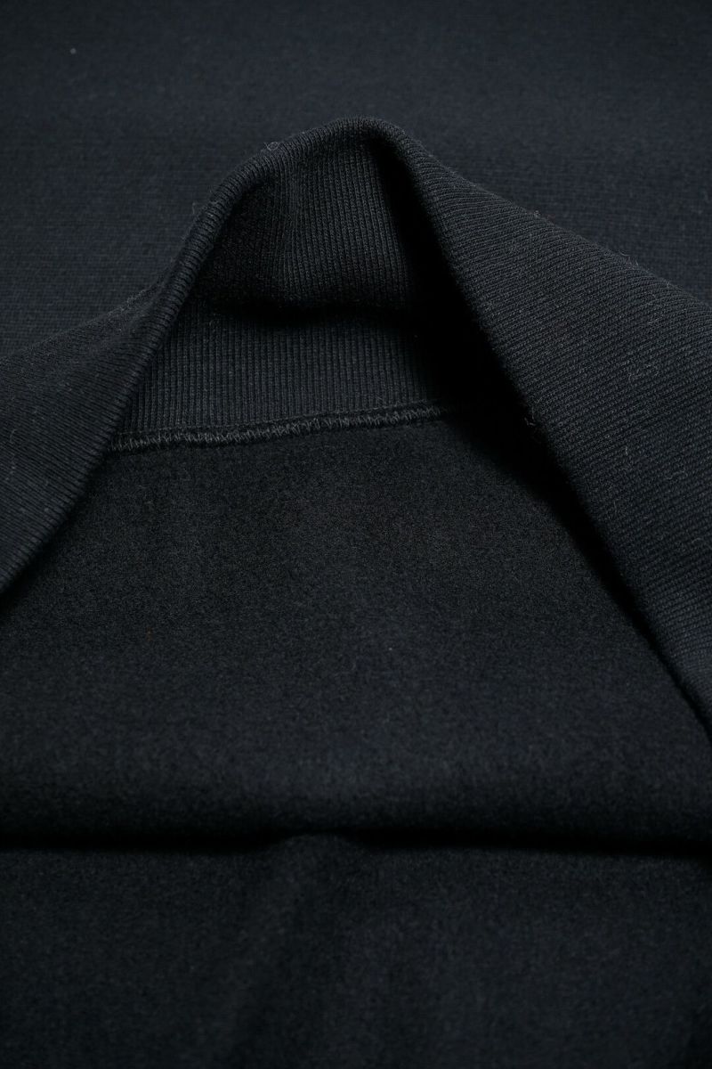 定番の26/2のBD系を使用したタートルネックスウェットです。素材は表糸に26/2のBD糸(空糸)を使ったスウェット地。元々硬めのBD糸を双糸にして、さらに詰めで編み立てる事でシャリ味のあるバルキーなタッチに仕上げています。裏のパイル面は細かくフル起毛させることで、保温性を高め、しなやかな肌触りになっています。