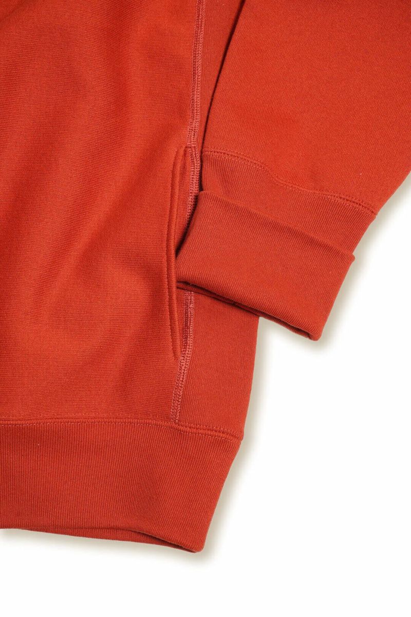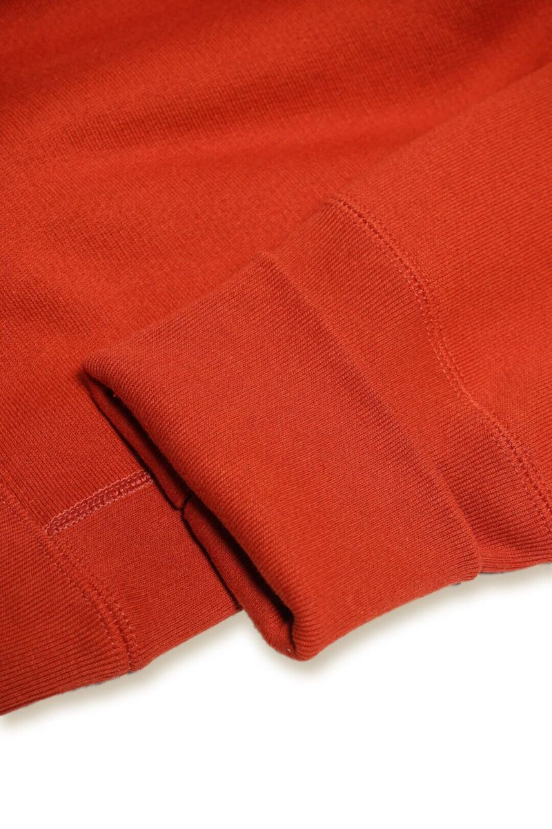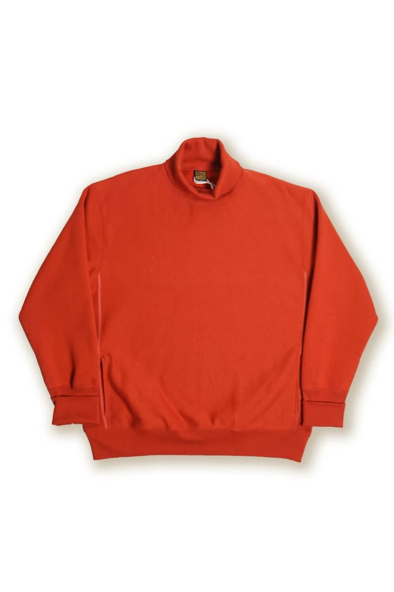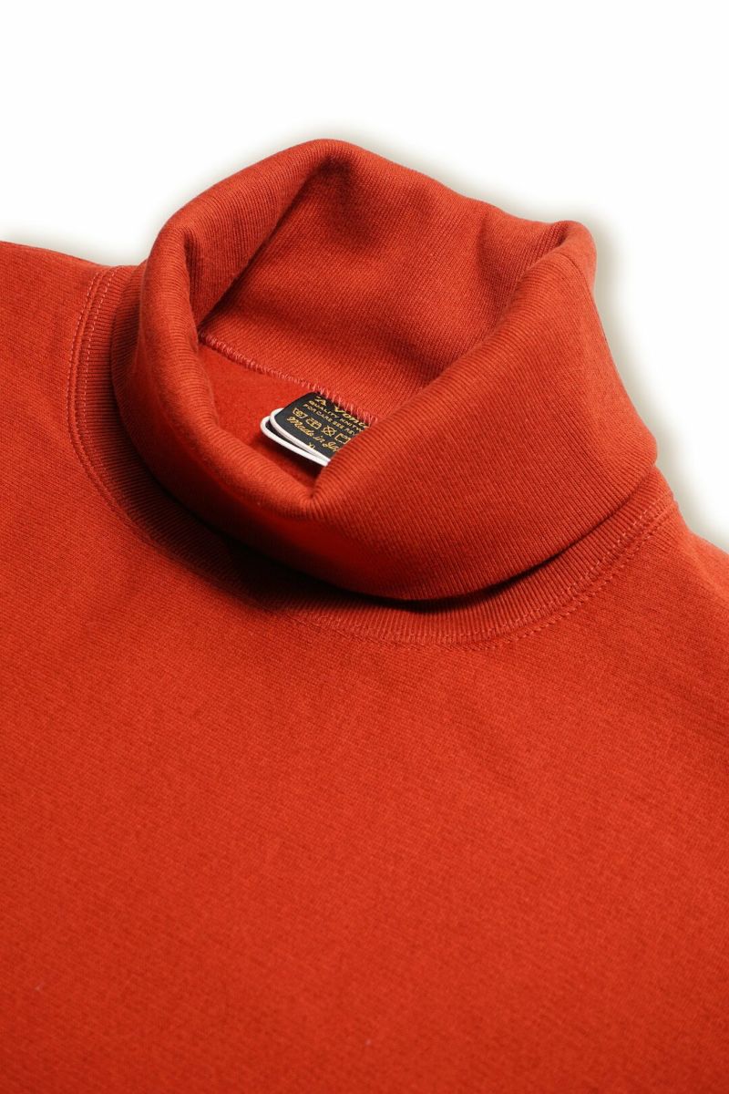 定番の26/2のBD系を使用したタートルネックスウェットです。素材は表糸に26/2のBD糸(空糸)を使ったスウェット地。元々硬めのBD糸を双糸にして、さらに詰めで編み立てる事でシャリ味のあるバルキーなタッチに仕上げています。裏のパイル面は細かくフル起毛させることで、保温性を高め、しなやかな肌触りになっています。