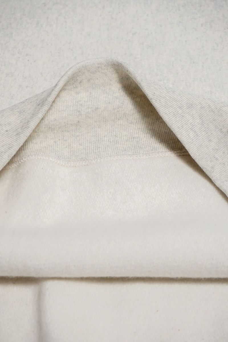 定番の26/2のBD系を使用したタートルネックスウェットです。素材は表糸に26/2のBD糸(空糸)を使ったスウェット地。元々硬めのBD糸を双糸にして、さらに詰めで編み立てる事でシャリ味のあるバルキーなタッチに仕上げています。裏のパイル面は細かくフル起毛させることで、保温性を高め、しなやかな肌触りになっています。