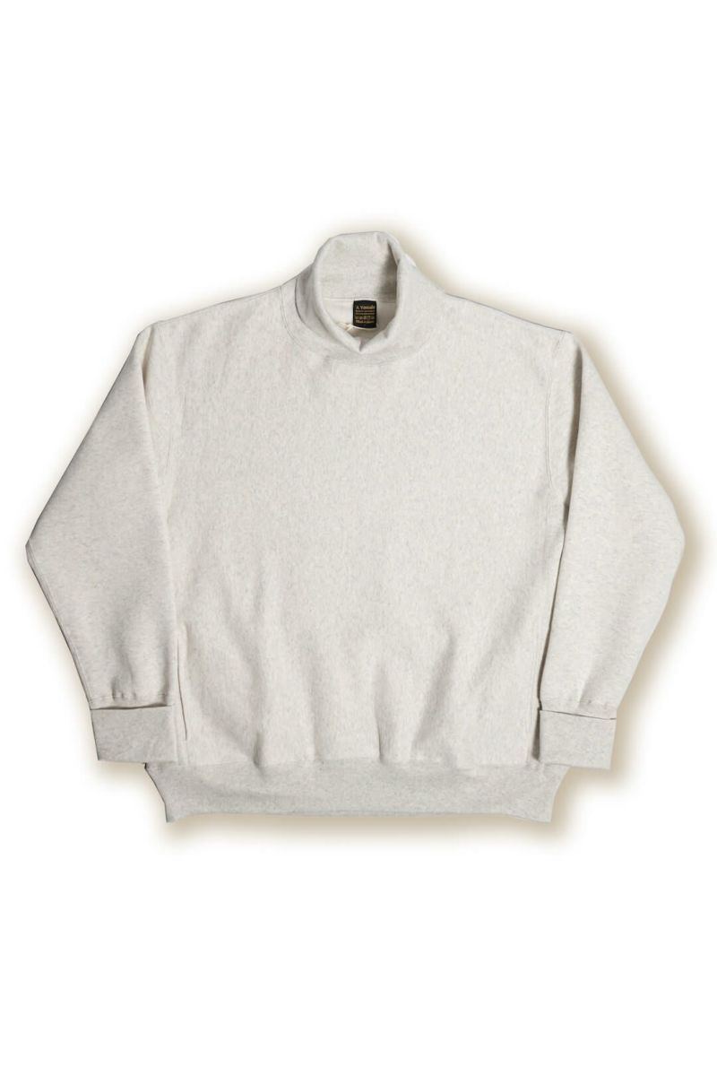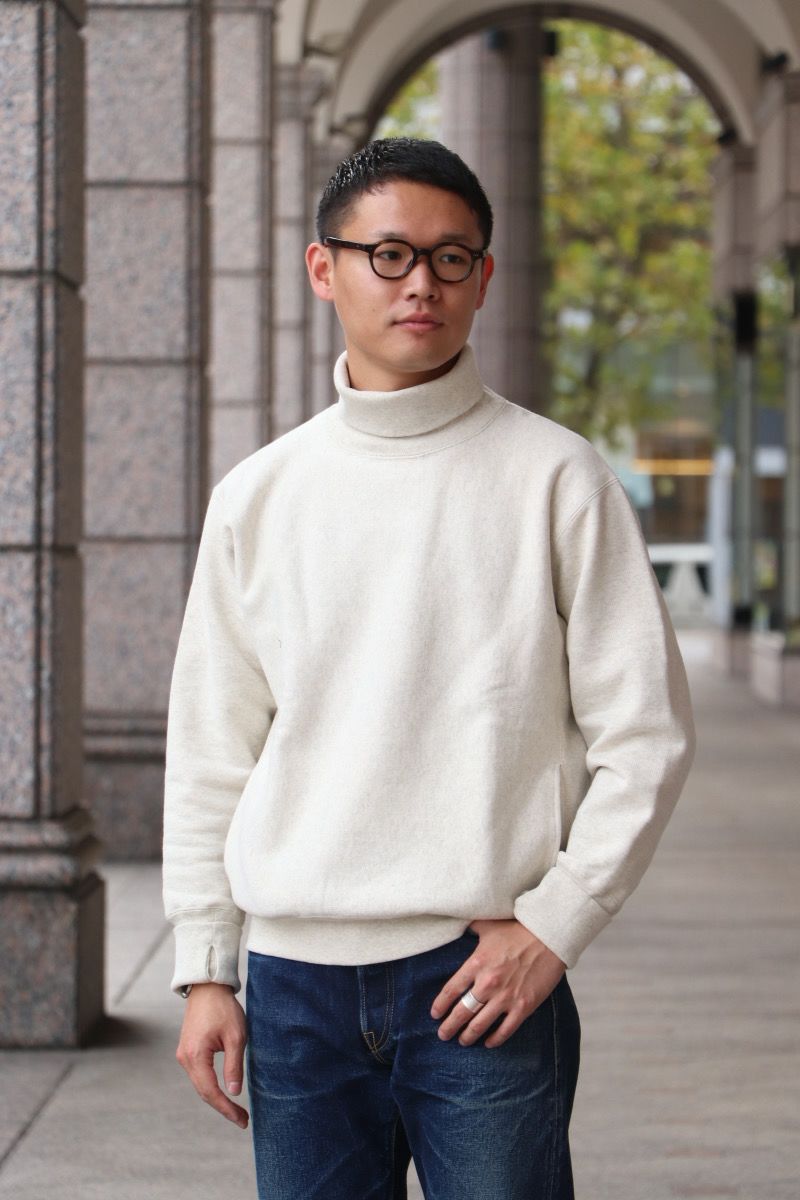 定番の26/2のBD系を使用したタートルネックスウェットです。素材は表糸に26/2のBD糸(空糸)を使ったスウェット地。元々硬めのBD糸を双糸にして、さらに詰めで編み立てる事でシャリ味のあるバルキーなタッチに仕上げています。裏のパイル面は細かくフル起毛させることで、保温性を高め、しなやかな肌触りになっています。