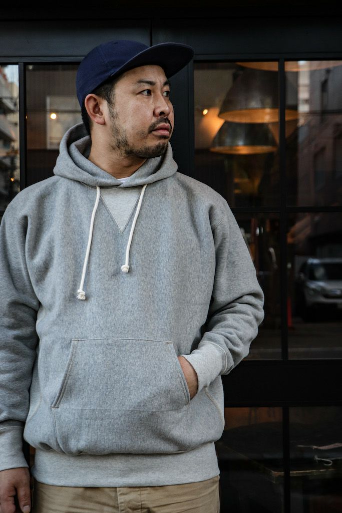 デニムと同じく原綿の配合から糸の捻までこだわったこだわりの吊り裏毛PARKA。原綿の種類産地によって質感、手触り、色などがかわりますがそれをデザイナー森島氏により組み合わせられ理想の生地に仕上げられています。
