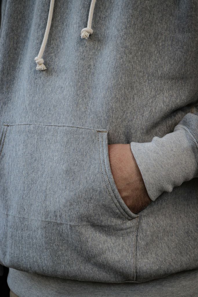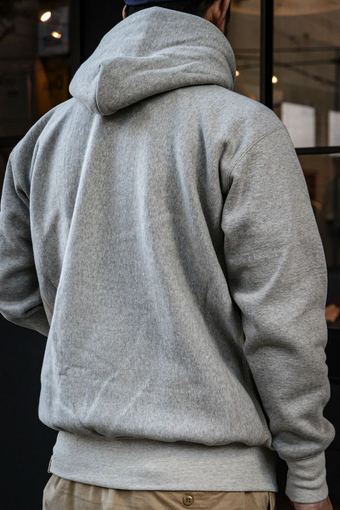 デニムと同じく原綿の配合から糸の捻までこだわったこだわりの吊り裏毛PARKA。原綿の種類産地によって質感、手触り、色などがかわりますがそれをデザイナー森島氏により組み合わせられ理想の生地に仕上げられています。